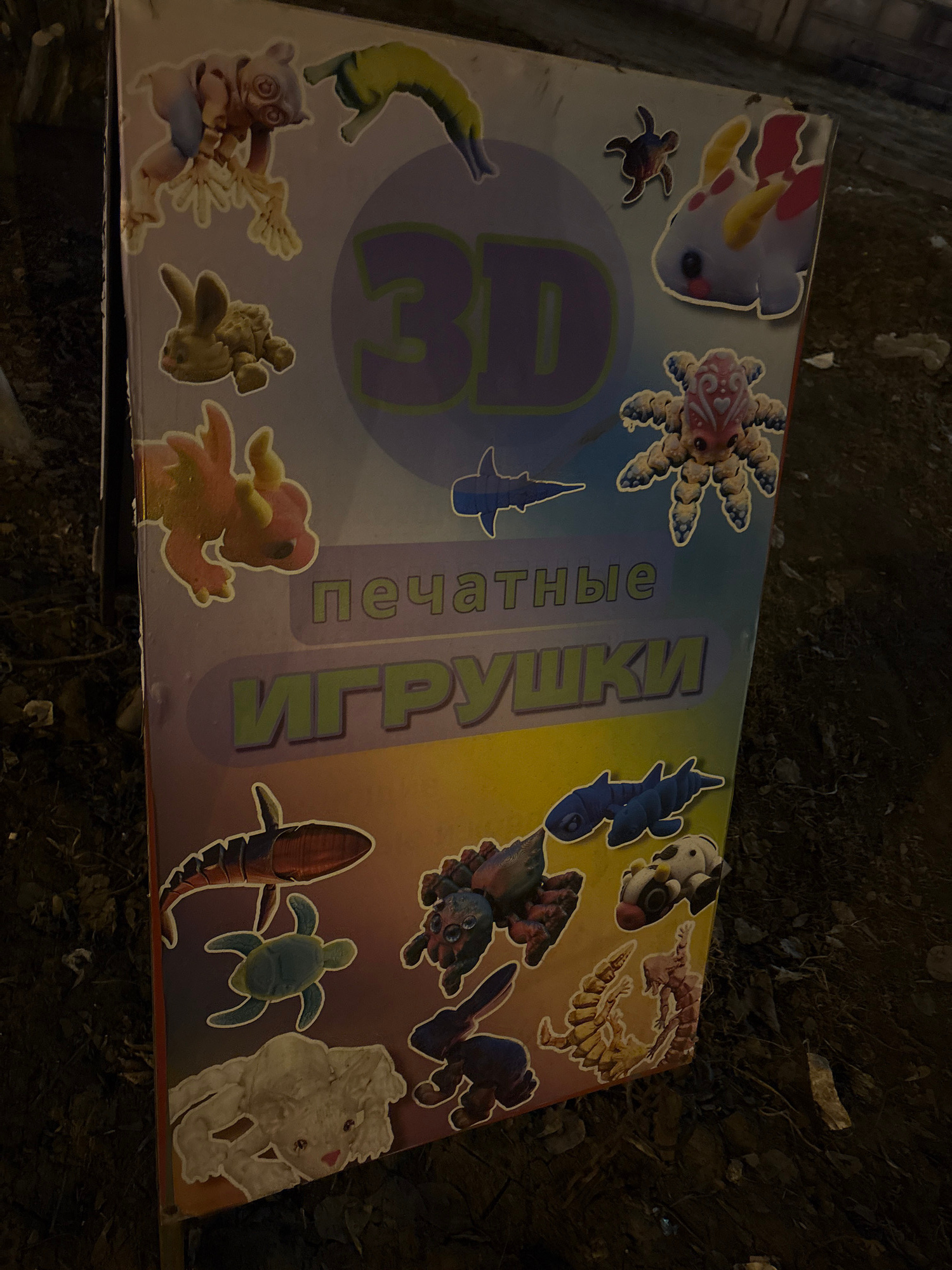 The image shows a promotional sign lying on the ground, likely near a street or sidewalk. The sign advertises "3D printed toys" written in Russian. The sign depicts various 3D printed toy designs, inc…read more