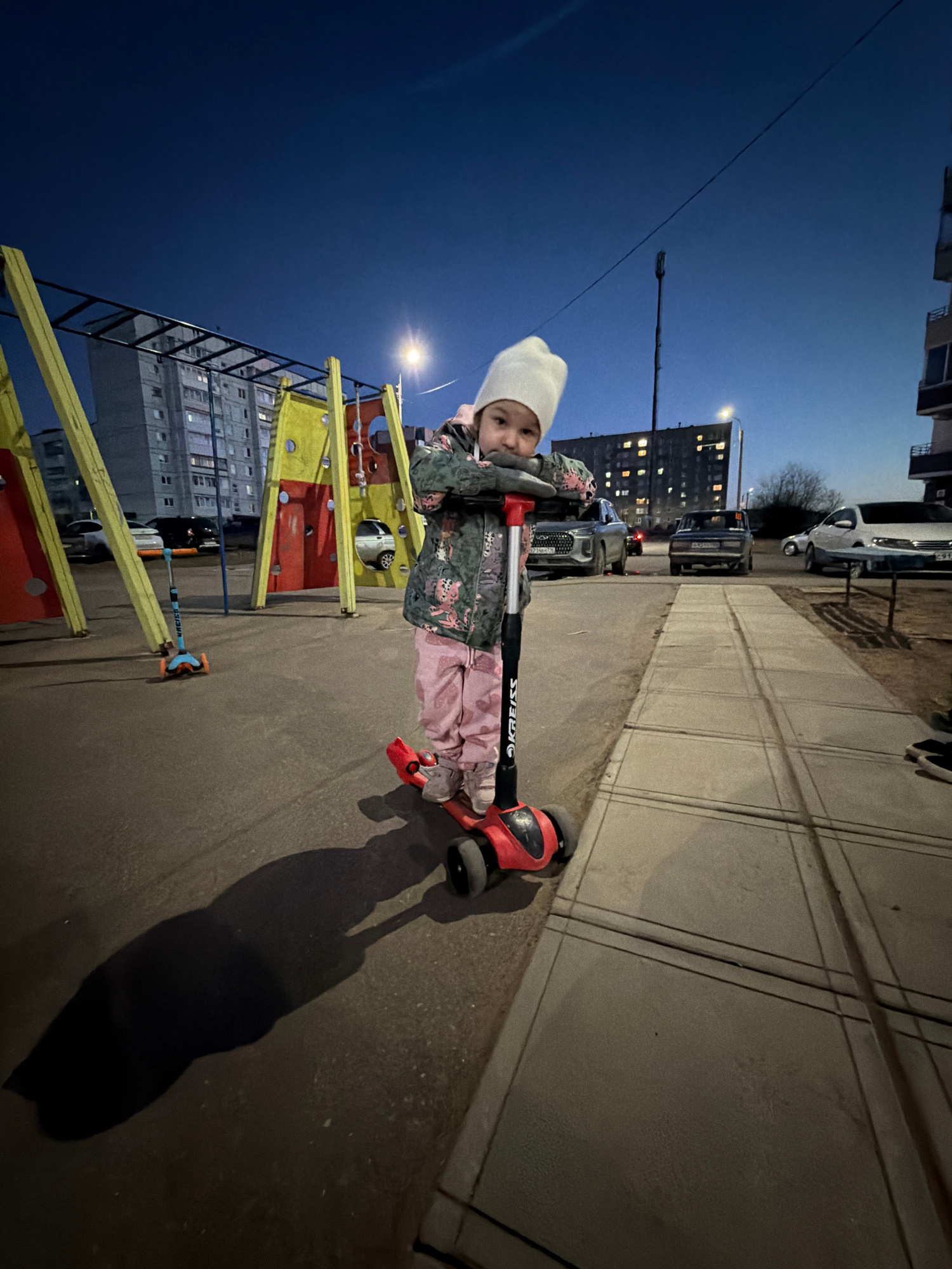 A young child in a white hat, pink pants, and a camouflage jacket is riding a scooter on a sidewalk near a playground in Chaikovsky, Russia. The sky is dusky, suggesting early evening. Behind the chil…read more