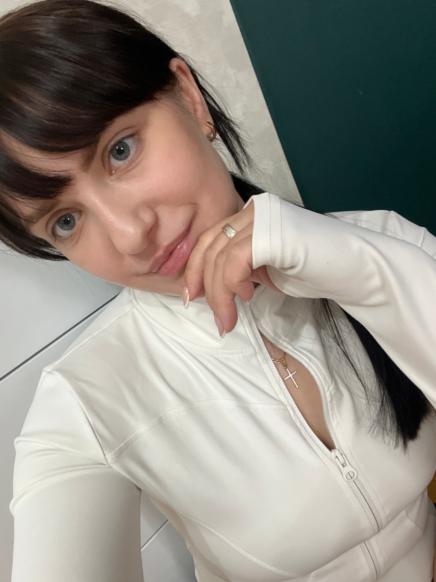 A rotated, close-up portrait depicts a young woman with dark hair and wide blue eyes looking directly at the viewer. Her dark hair is styled with bangs, framing her face. She is wearing a white, long-…read more