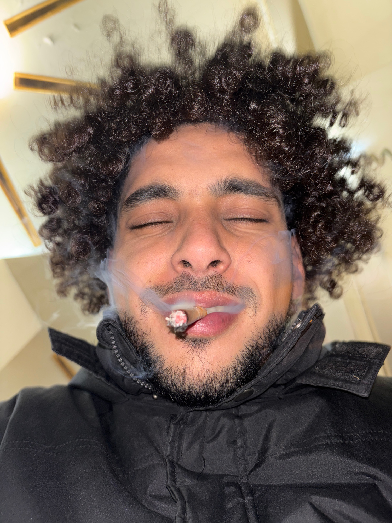A man with curly hair and a beard is lying down, eyes closed, with a lit cigarette in his mouth, smoke rising. He is wearing a black jacket. The location is unknown.