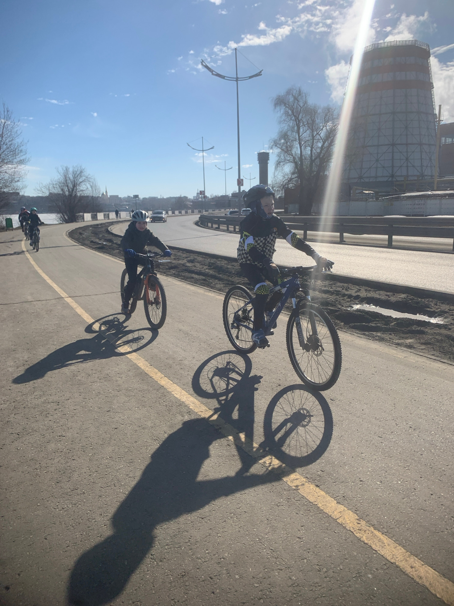 The image shows a group of cyclists riding on a paved path in Izhevsk, Russia. In the background is a tall industrial structure. Two cyclists are prominently visible in the foreground. The cyclist on…read more