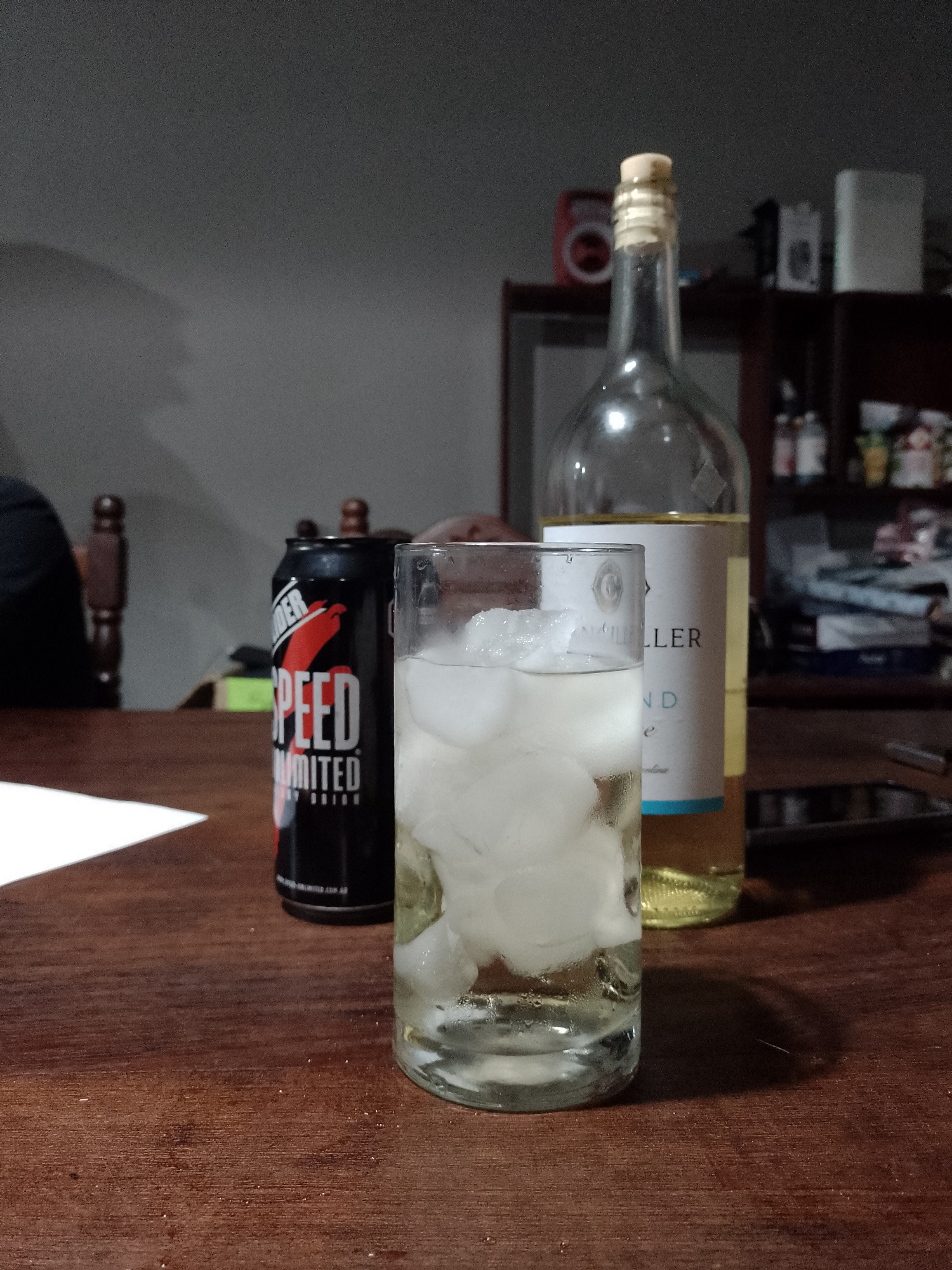 The photograph shows a dark wooden table in Gobernador Julio A. Costa, Argentina. On the table, there is a glass filled with ice and a clear liquid, a black can with the words "SPEED UNLIMITED" in whi…read more