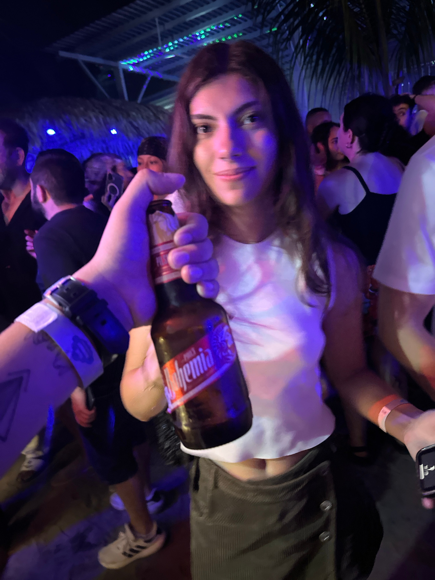 The image shows a group of people in what appears to be a crowded, dimly lit indoor or semi-outdoor setting. A woman with long brown hair is in focus, looking directly at the camera and holding a bott…read more