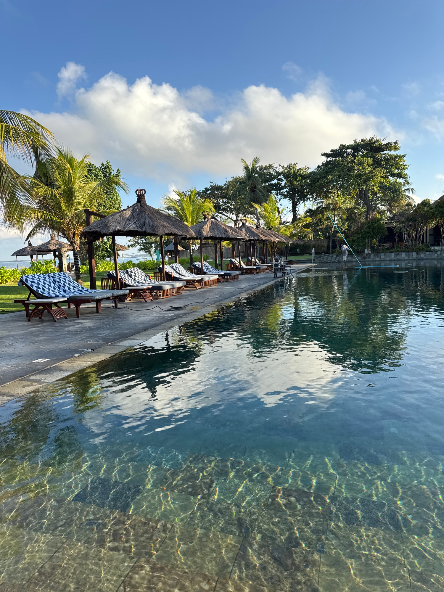 The photograph depicts a tranquil scene at a resort in Jimbaran, Indonesia. Along the edge of a clear, blue-water pool, several lounge chairs are arranged under thatched umbrellas. The chairs are part…read more