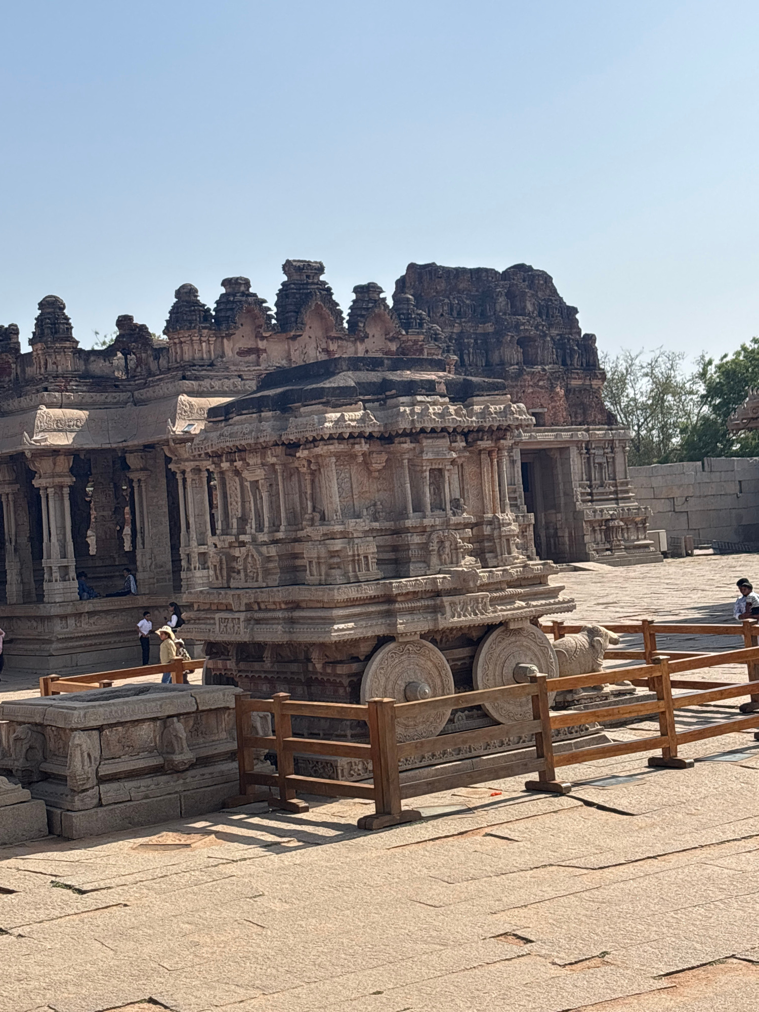 The image shows the Stone Chariot at the Vittala Temple complex in Hampi, India. The chariot, a monolithic structure, is made of stone and features intricately carved wheels. A wooden fence surrounds…read more