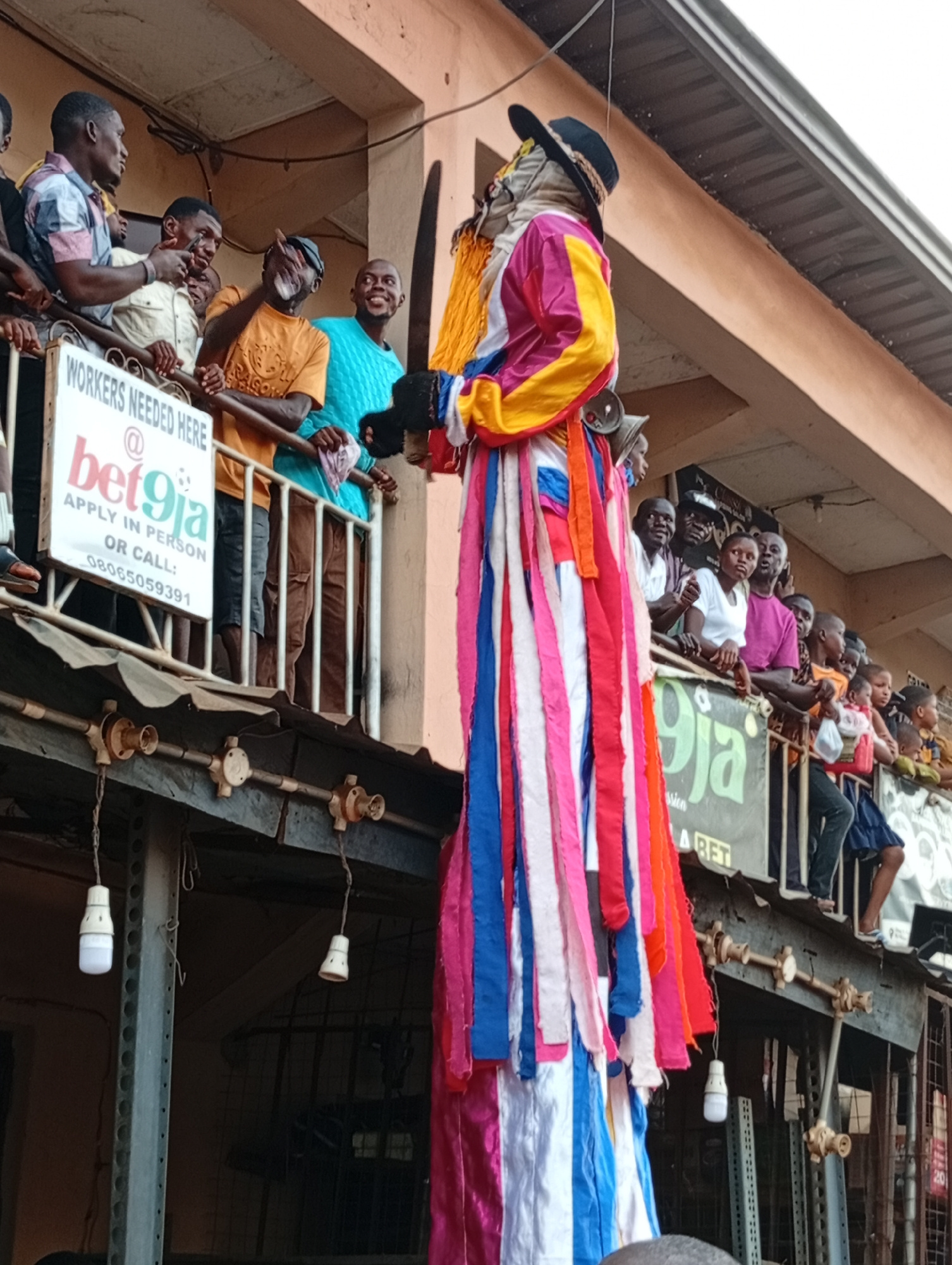 Here is a detailed description of the image: **Scene:** An outdoor scene in a city of Unknown, Unknown shows a crowded balcony or veranda. A tall figure in elaborate colorful garb stands out, attract…read more