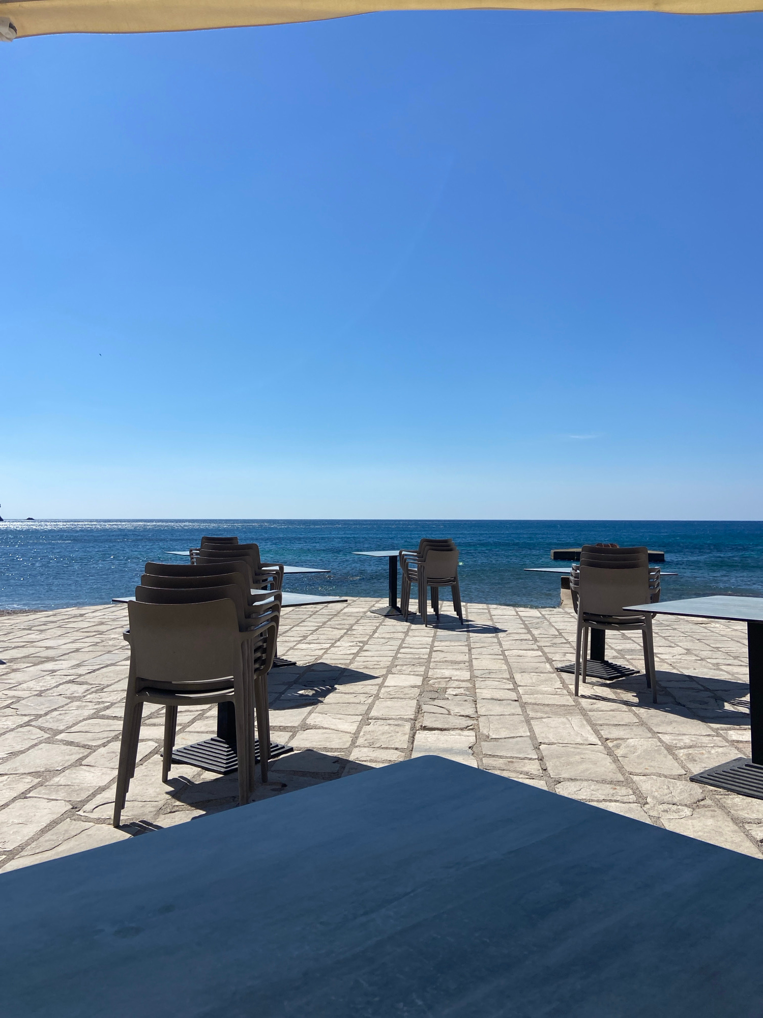 The image shows a view of the Adriatic Sea from an outdoor dining area in Budva, Montenegro. The sky is clear and blue. The sea is a slightly darker shade of blue, with some visible wave patterns. Alo…read more