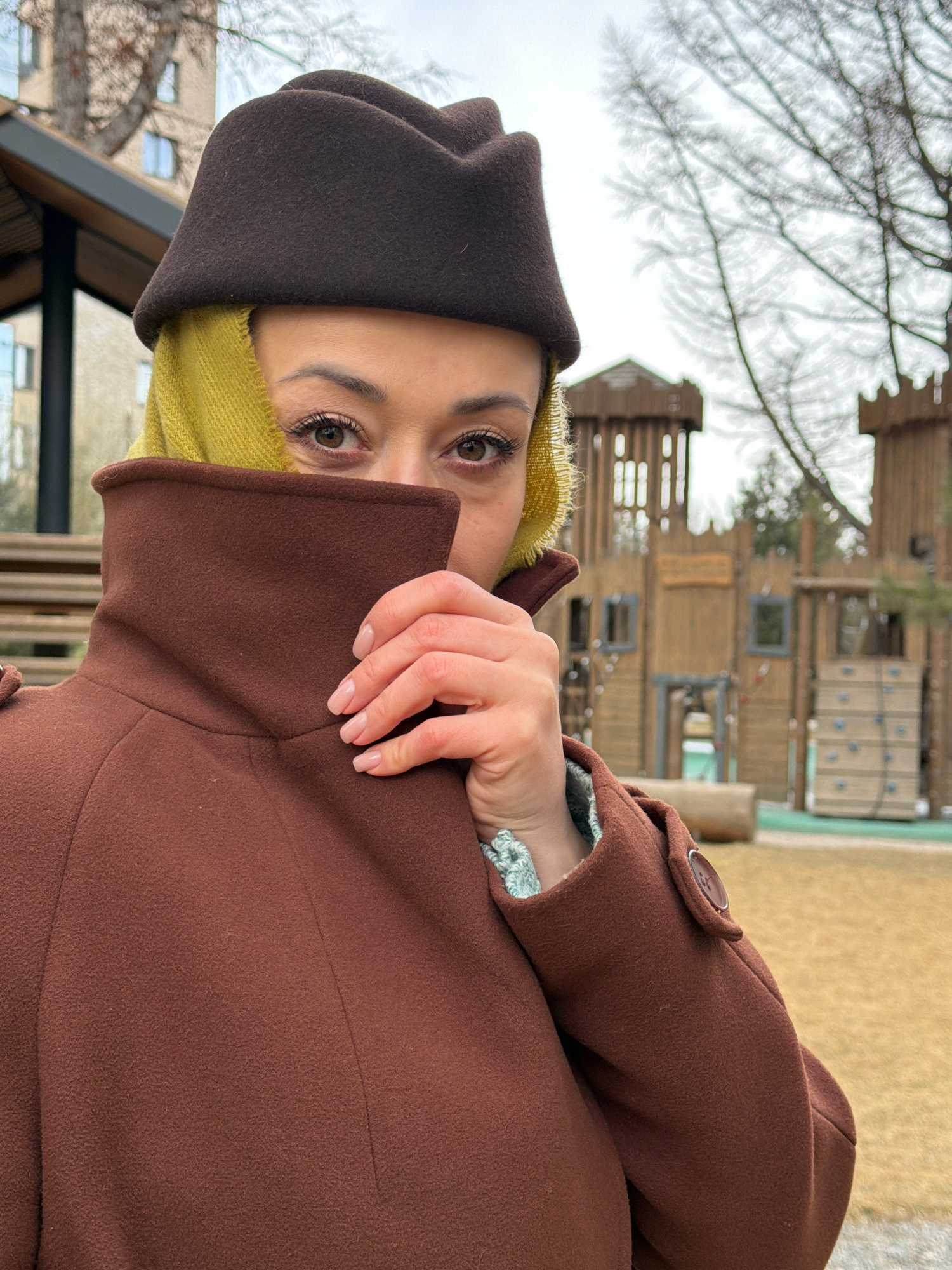 A woman stands outdoors, partially concealed by a brown coat pulled up over her mouth and nose. She wears a dark brown hat and a yellow under-layer around her face. Her eyes are visible, and one handβ¦read more