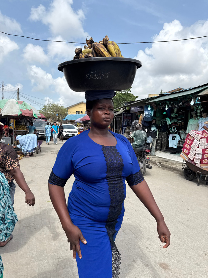 The image displays a bustling outdoor market street in Lagos, Nigeria, under a partially cloudy sky. The primary subject is an adult woman with dark skin, centrally positioned, walking towards the vie…read more