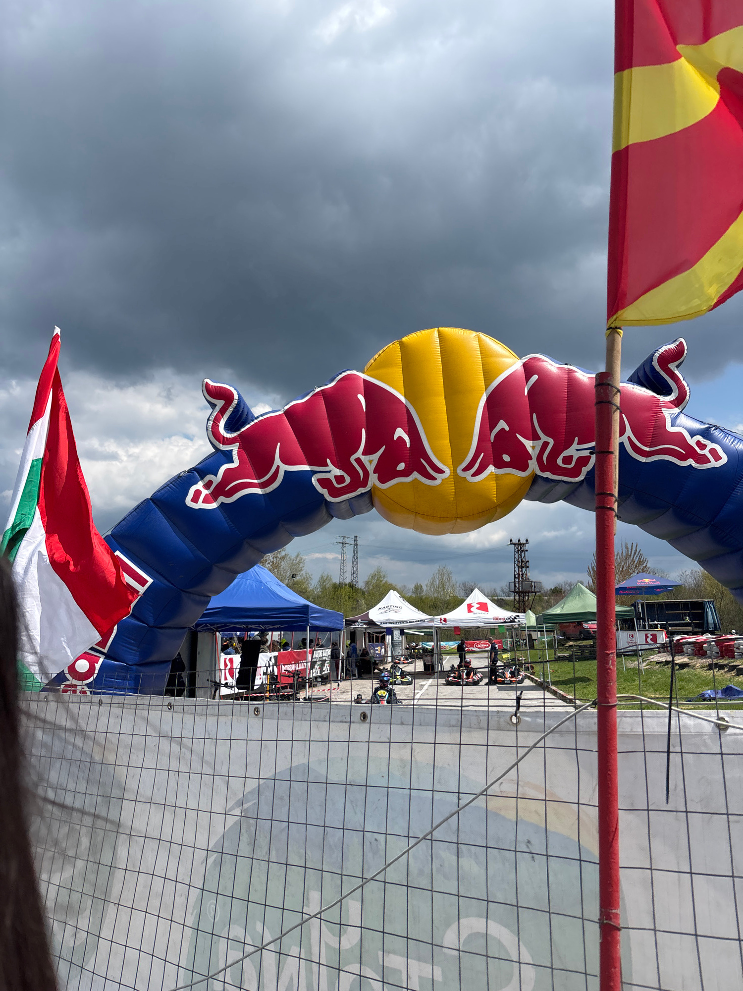The image shows a Red Bull archway, a yellow and red striped flag, and a red, white, and green flag (likely the Hungarian flag) on a cloudy day. In the background, there are tents, people, and racing…read more