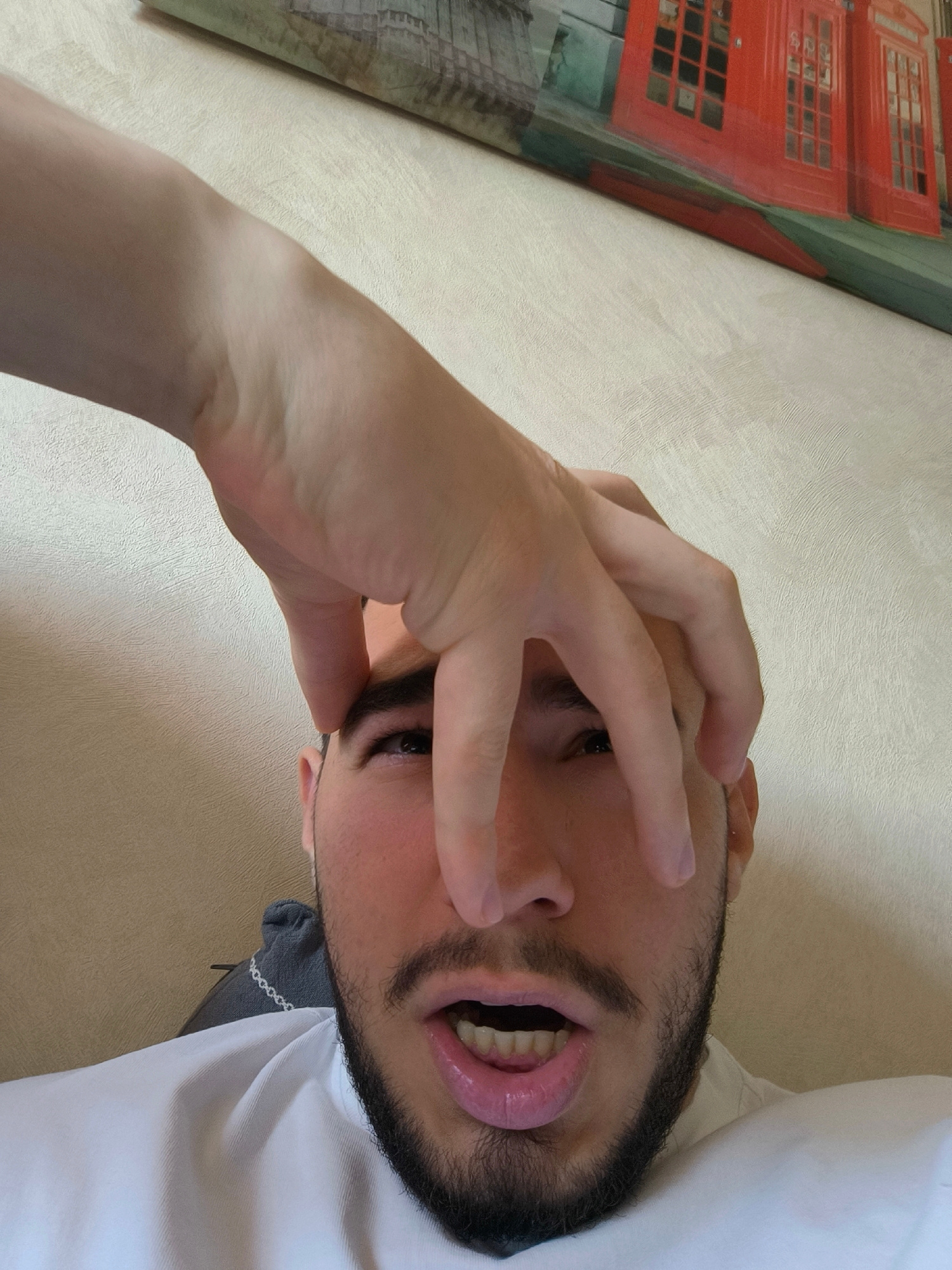 The image presents a close-up, high-angle perspective of a person with dark hair and a beard, seen from the neck up, in an indoor setting. A second person's light-skinned arm and hand are prominently…read more