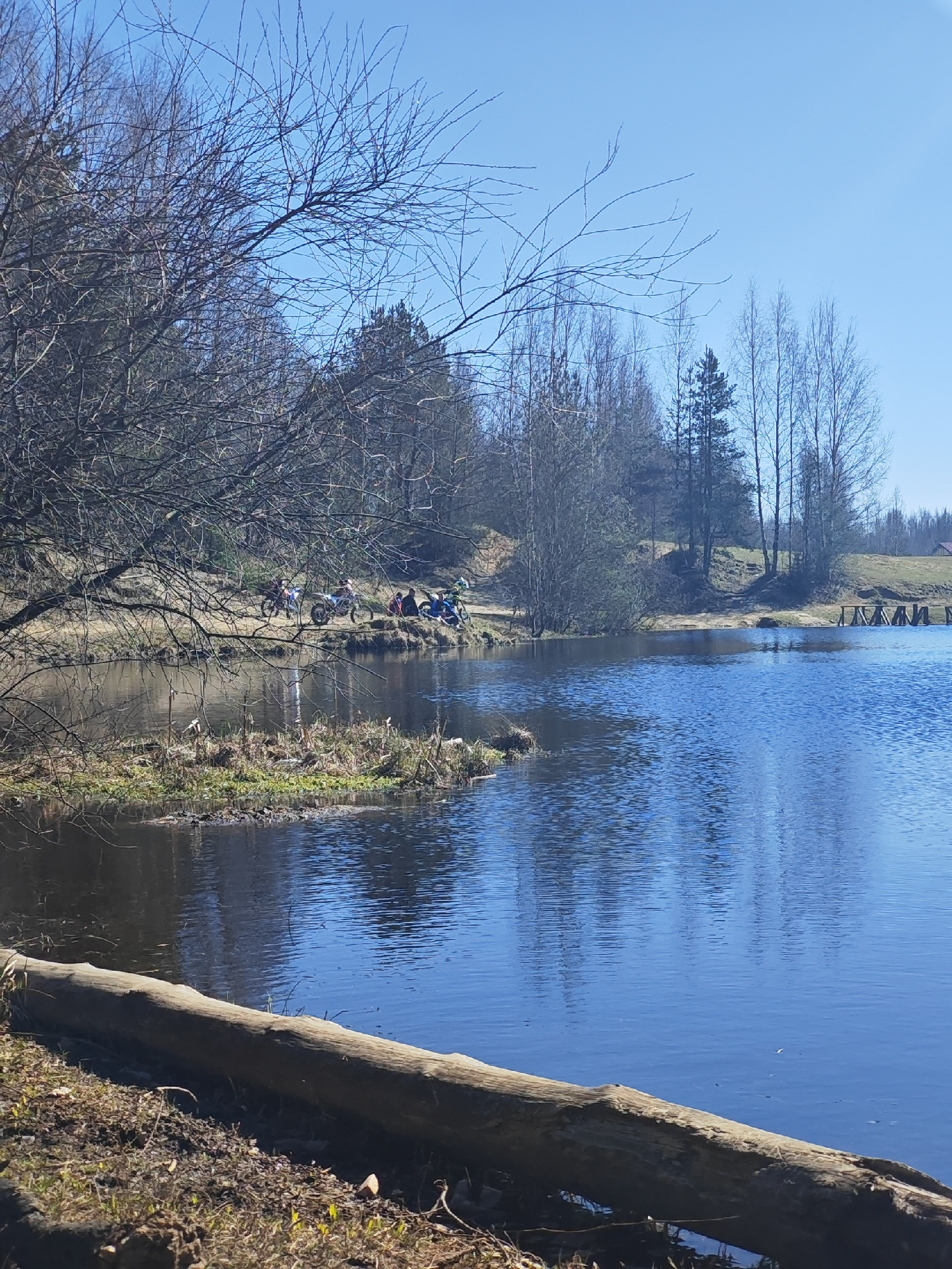 The image depicts a tranquil scene at a lake or pond in Tokkari-Lend, Russia. The foreground features a fallen tree trunk lying along the water's edge, surrounded by dry vegetation. The body of water…read more