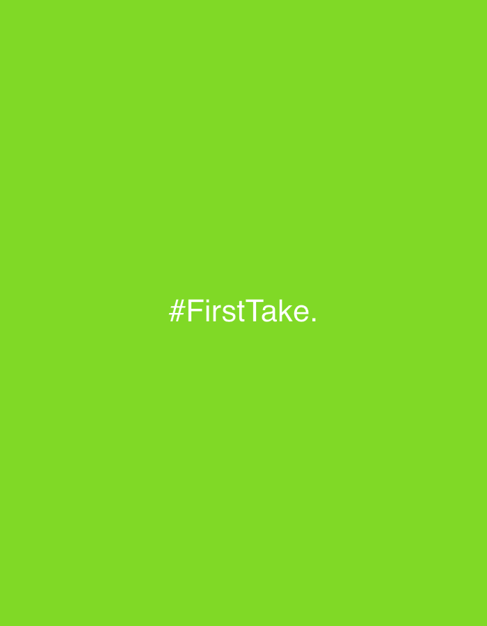 The image displays a solid, uniform lime green background. Centered horizontally and vertically on this background is the text "#FirstTake." rendered in white sans-serif font, followed by a period. No…read more
