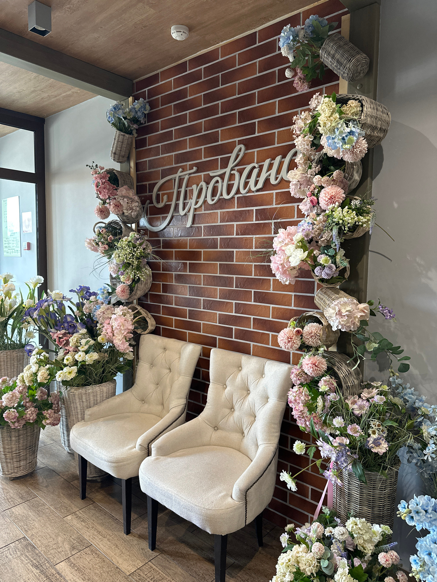 The image shows an interior decorated with flowers and wicker baskets, along with two white tufted armchairs. The background features a brick-patterned wall with a white cursive word on it, possibly a…read more