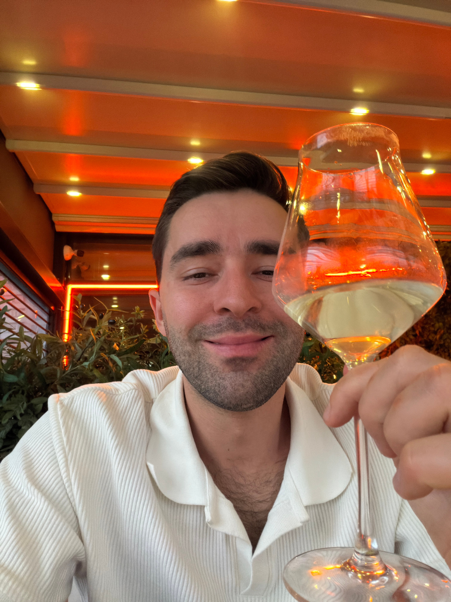 A man is holding a glass of white wine in front of his face. He is wearing a white, textured shirt with a prominent collar. The background includes orange-lit vertical stripes, possibly an interior deβ¦read more