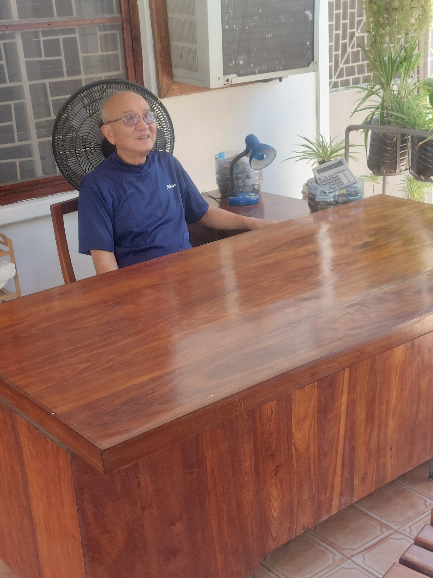 An older man with glasses and short grey hair, wearing a blue short-sleeved collared shirt, is seated at a large, highly polished, dark reddish-brown wooden table or counter. He looks upwards and slig…read more