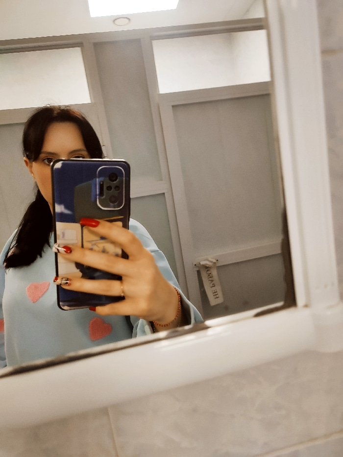 The image depicts a female individual taking a mirror selfie in an indoor setting. The specific location within the city of Donetsk, Ukraine, cannot be determined from the visual information provided.…read more