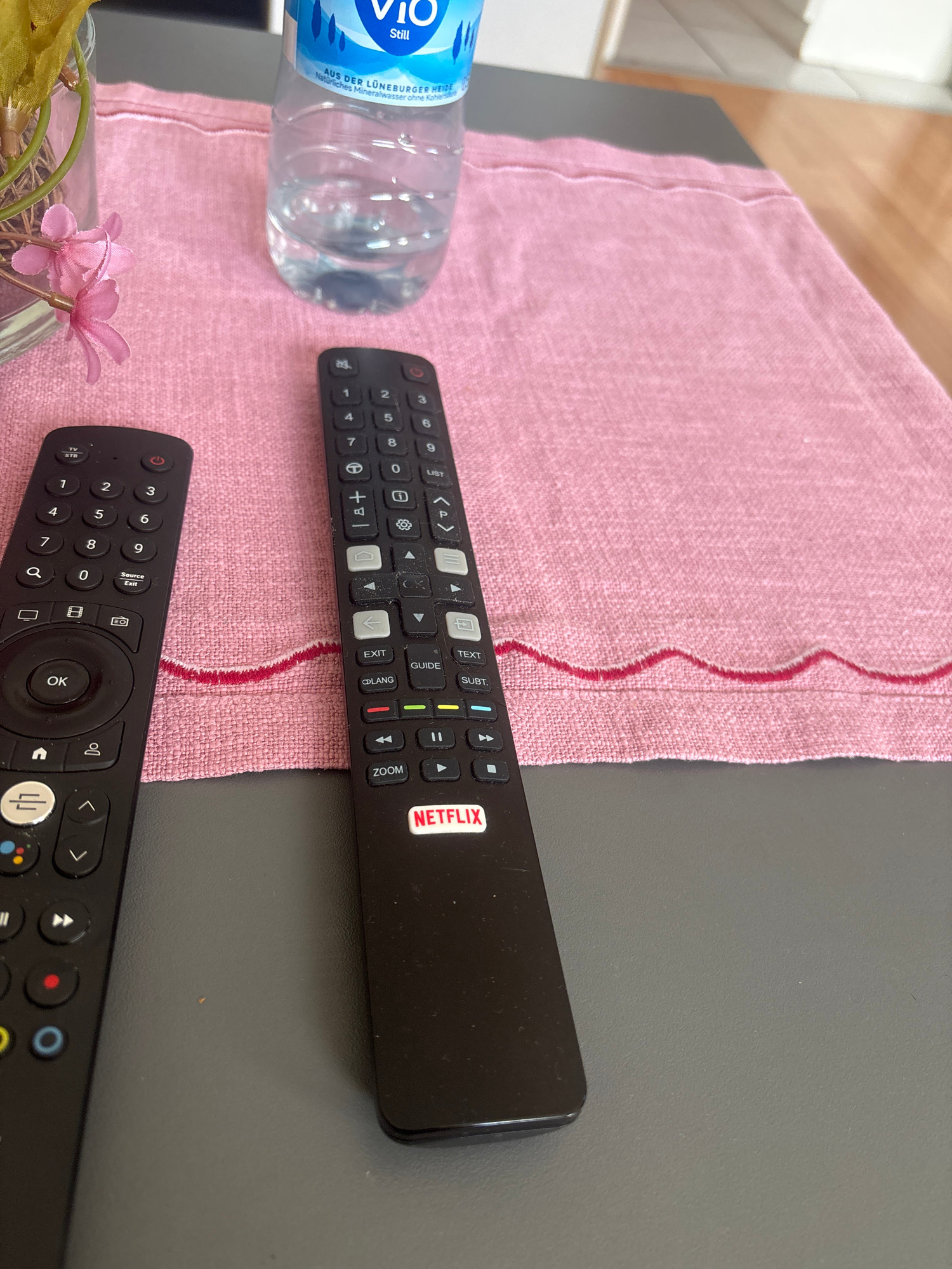 The image shows a still life on a gray surface, likely a table. A pink fabric with a wavy red border lies on the table, upon which a clear plastic bottle of Vio mineral water is placed. The water bott…read more
