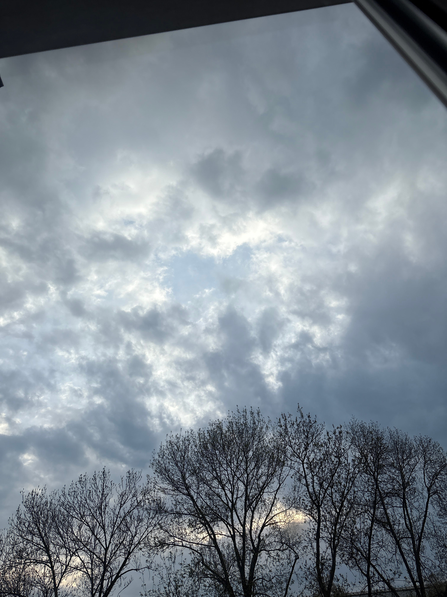 This media file captures a view looking up at a cloudy sky through bare tree branches, likely taken from an indoor or partially enclosed vantage point. The primary subjects are the sky and tree canop…read more