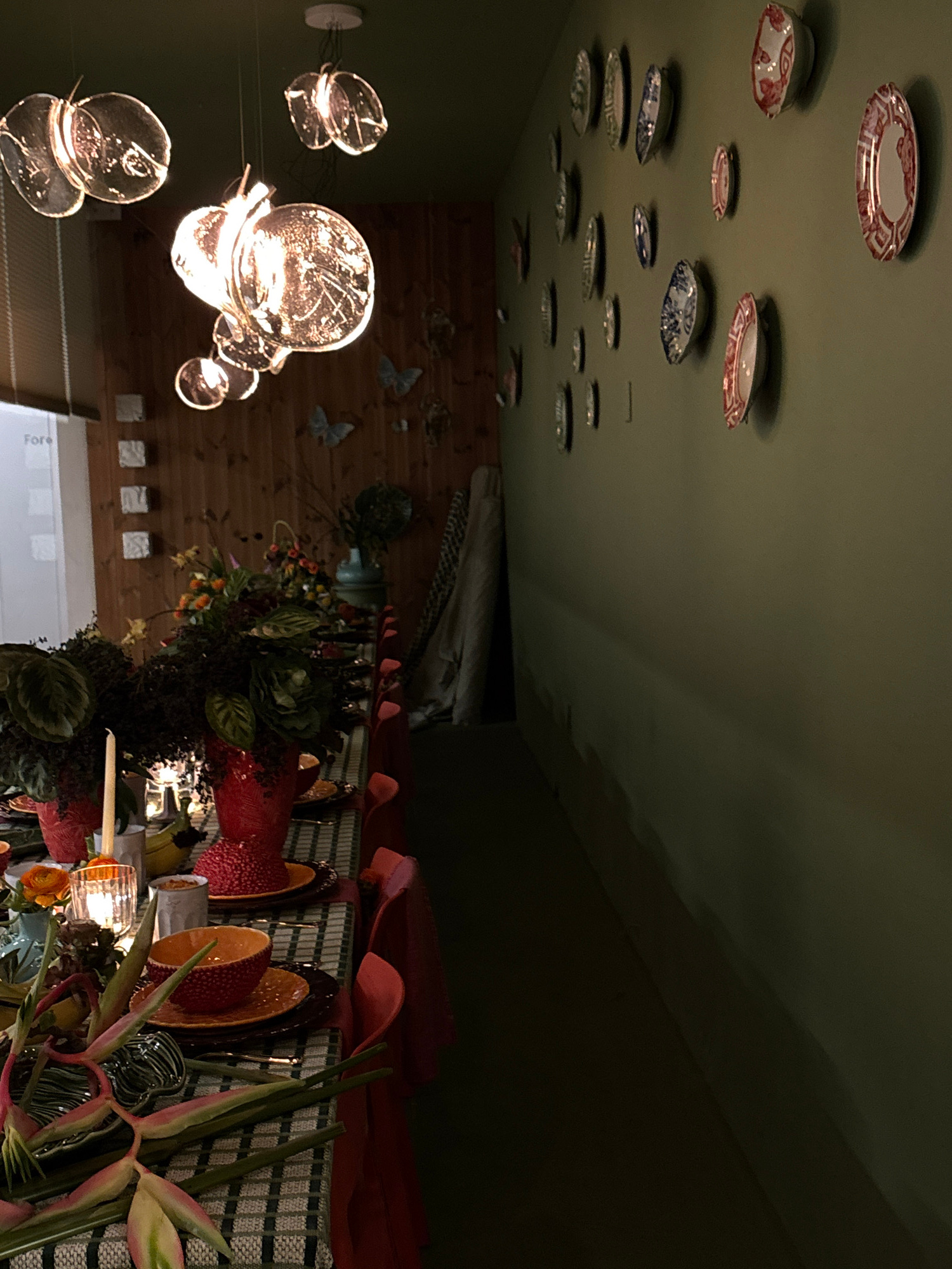 The image captures an elaborately decorated indoor dining space, likely set for an evening event. No people are visible. The scene is dominated by a long table adorned with a patterned tablecloth, pos…read more