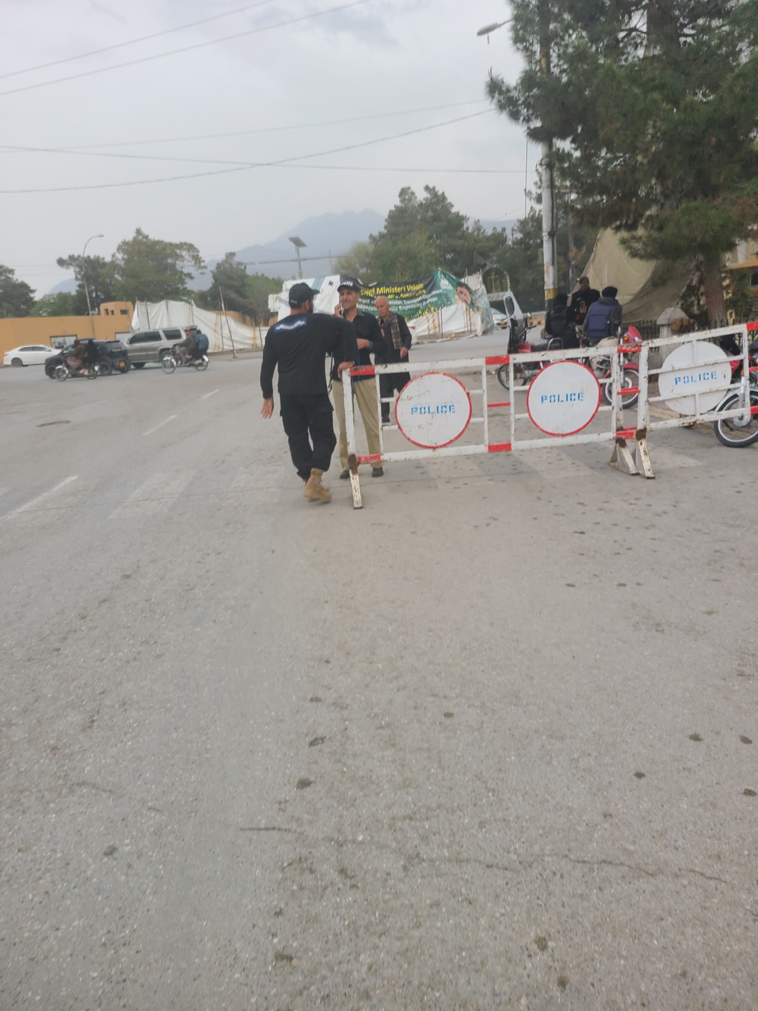 The image depicts a street scene in Quetta City Tehsil, Pakistan. A police barricade with "POLICE" written on it blocks the road. A police officer in a dark uniform steps over the barricade. Other ind…read more