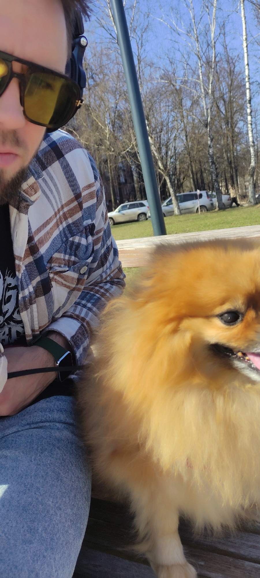 A man is taking a selfie with his Pomeranian dog on a bench. The man is wearing sunglasses and a plaid shirt. The dog is a light brown color. The background shows a park with bare trees and parked car…read more