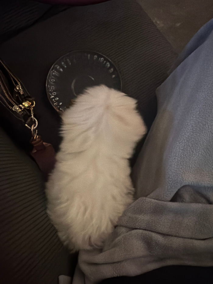 An overhead indoor view in Tibubeneng, Indonesia, captures a small, white, long-haired animal, likely a dog, positioned centrally with its back facing the camera. To the left of the animal, a dark lea…read more