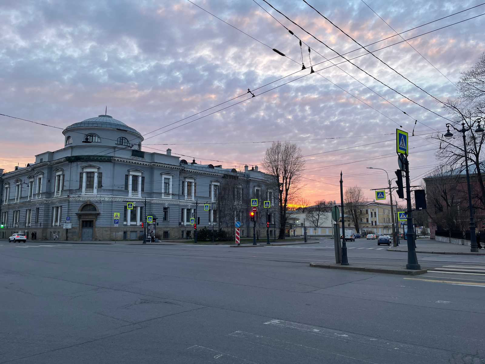 The image depicts a city intersection at twilight. In the left of the frame is a large, pale-gray building with a domed section. Crosswalk signs are visible at multiple points in the intersection. Tra…read more