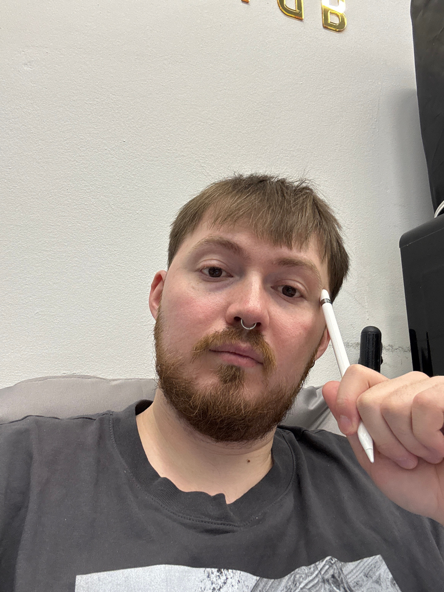 A man with light brown hair, a beard, and a nose ring holds a white stylus near his forehead. He is wearing a gray t-shirt. Behind him is a white wall with gold lettering and a black object. The locat…read more