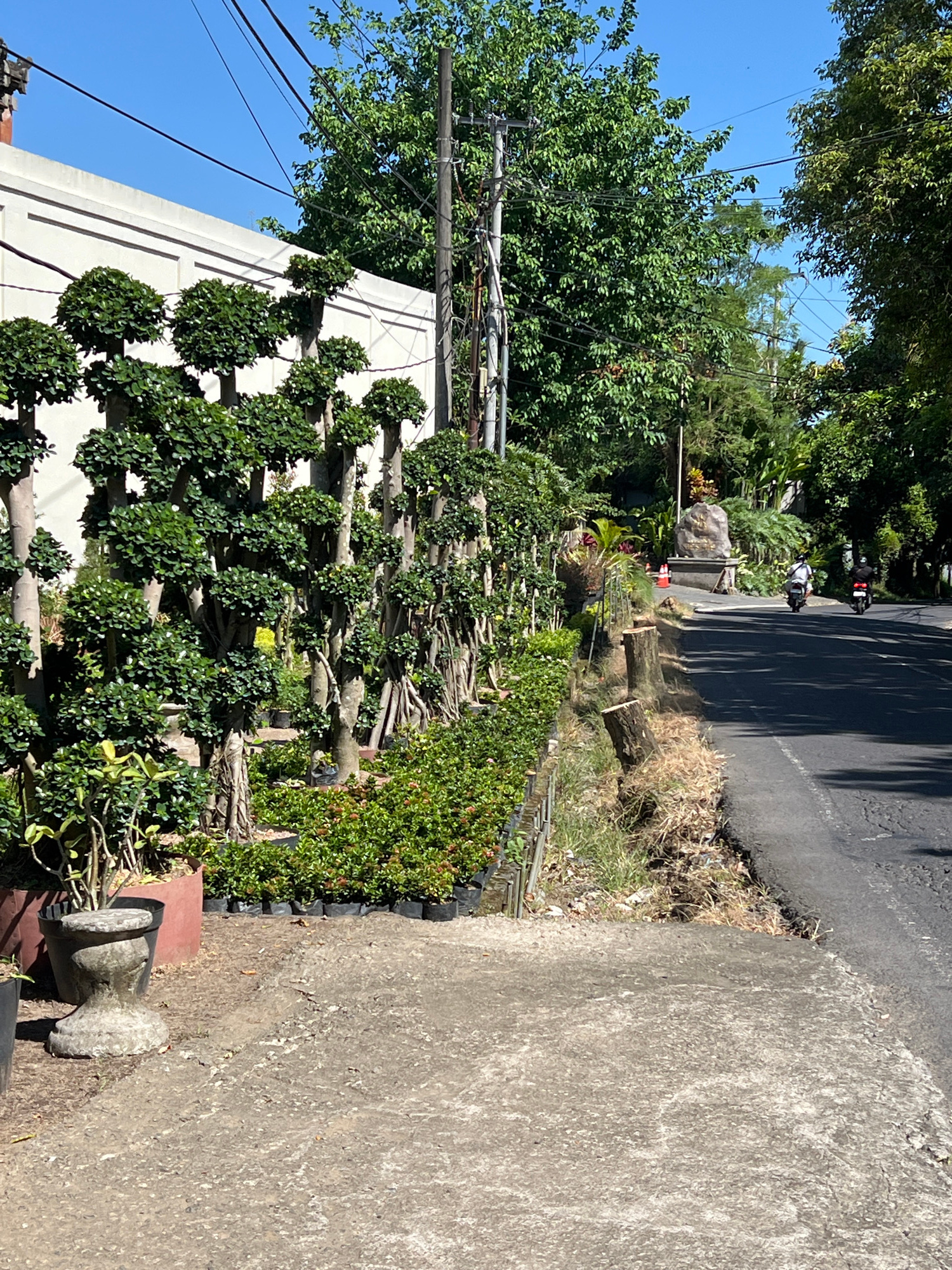 A sunny outdoor scene features a row of carefully cultivated trees in Sayan, Indonesia. These trees, with distinct, round, bushy tops and exposed trunks, line the edge of a building with a clean, whit…read more