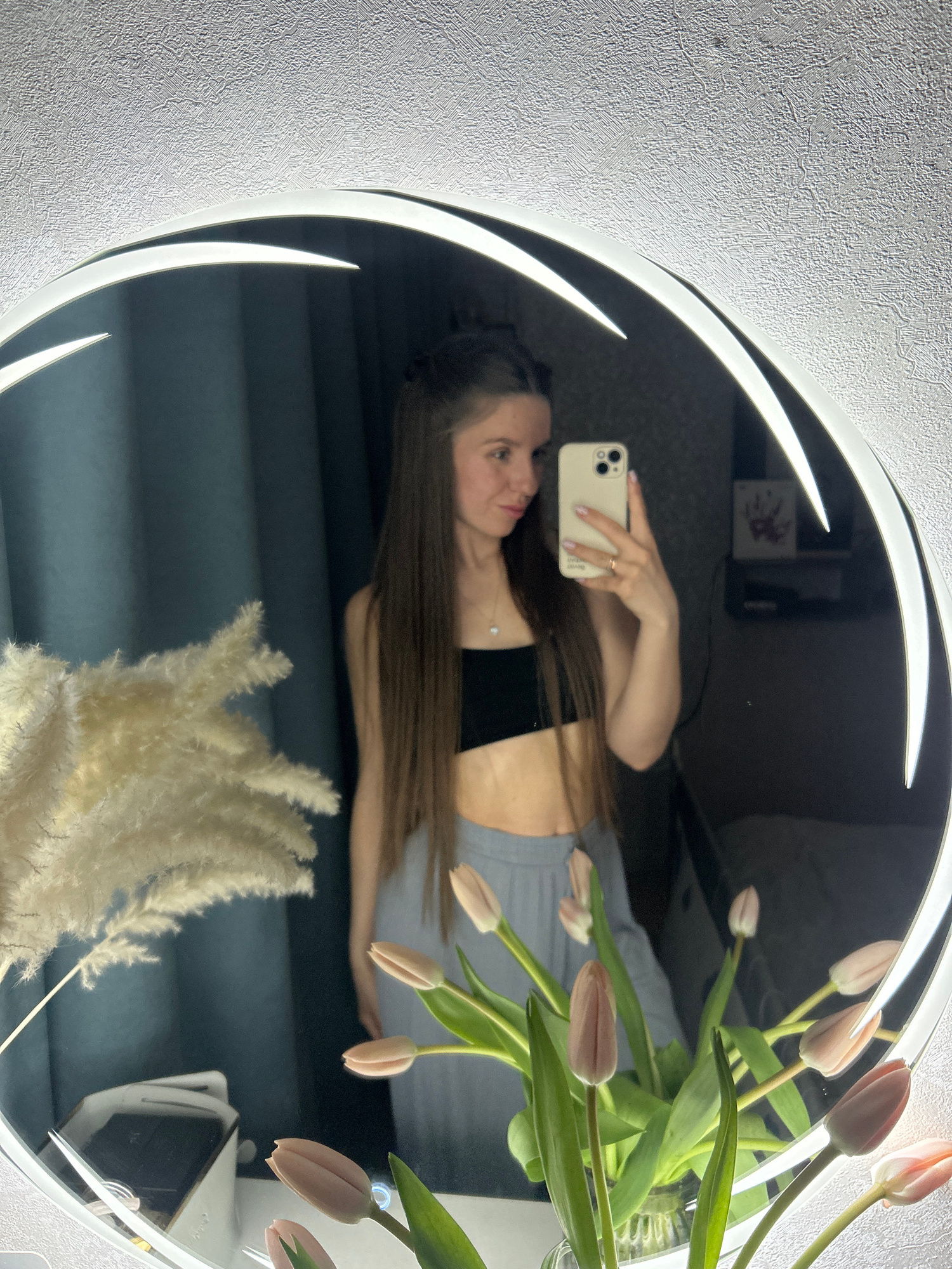 The image depicts a reflection in a circular mirror with an integrated light. The background appears to be a textured wall. A young woman is visible in the mirror's reflection, holding a smartphone an…read more