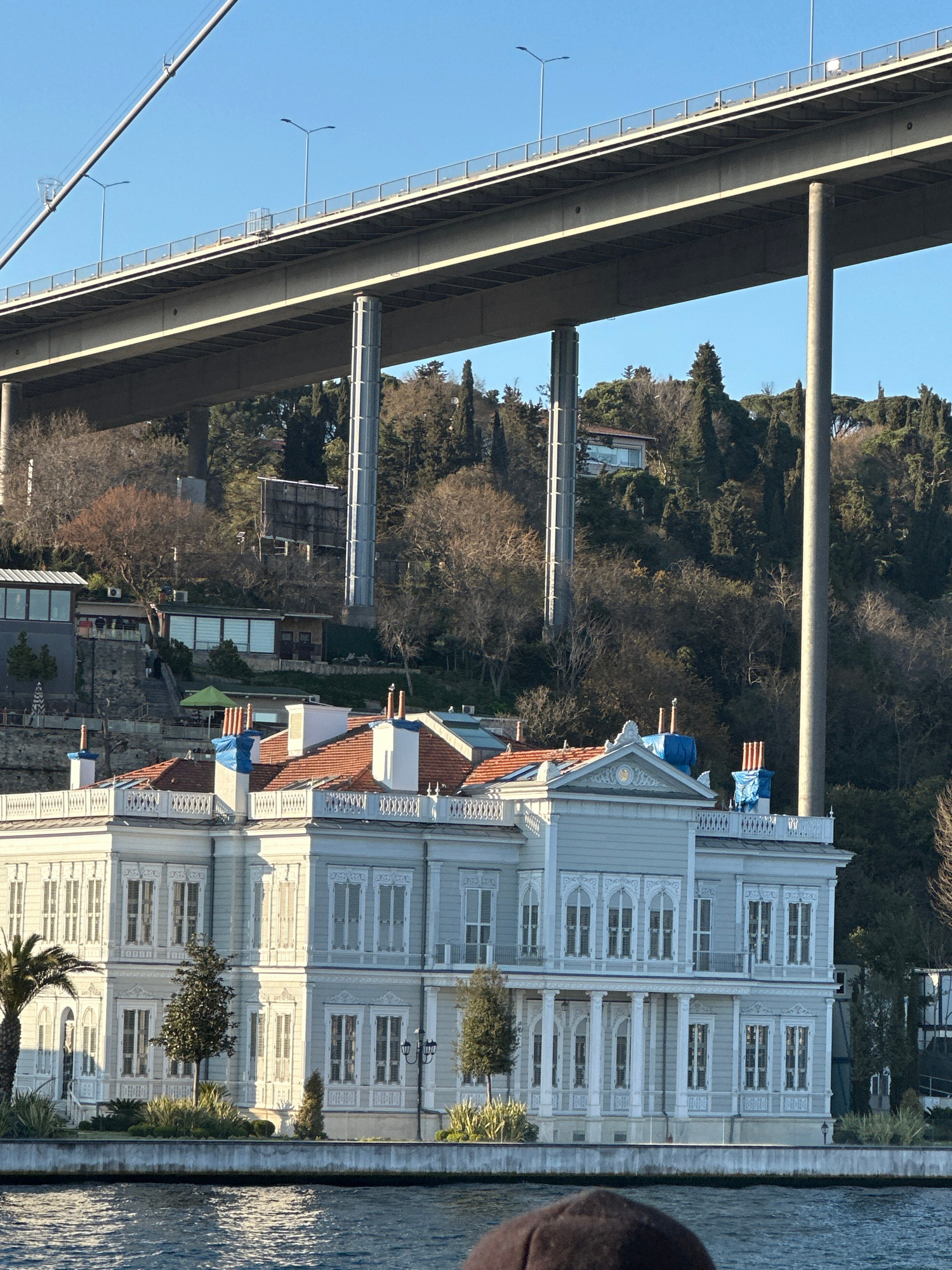 Captured from a vessel on the water, the image presents a landscape juxtaposing modern infrastructure with historical architecture. A segment of a suspension bridge dominates the left side of the fram…read more