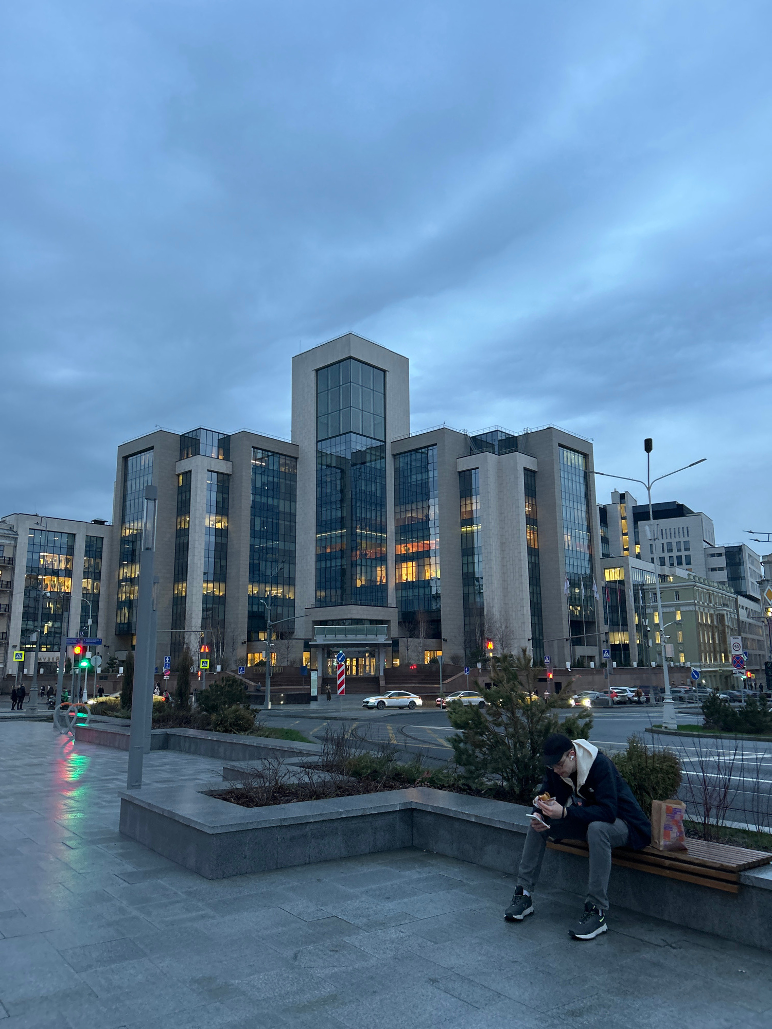 The image shows a street scene in Moscow, Russia at dusk. A person is sitting on a bench near a modern building. The building has a tiered structure with glass and stone facades. Lights are visible in…read more