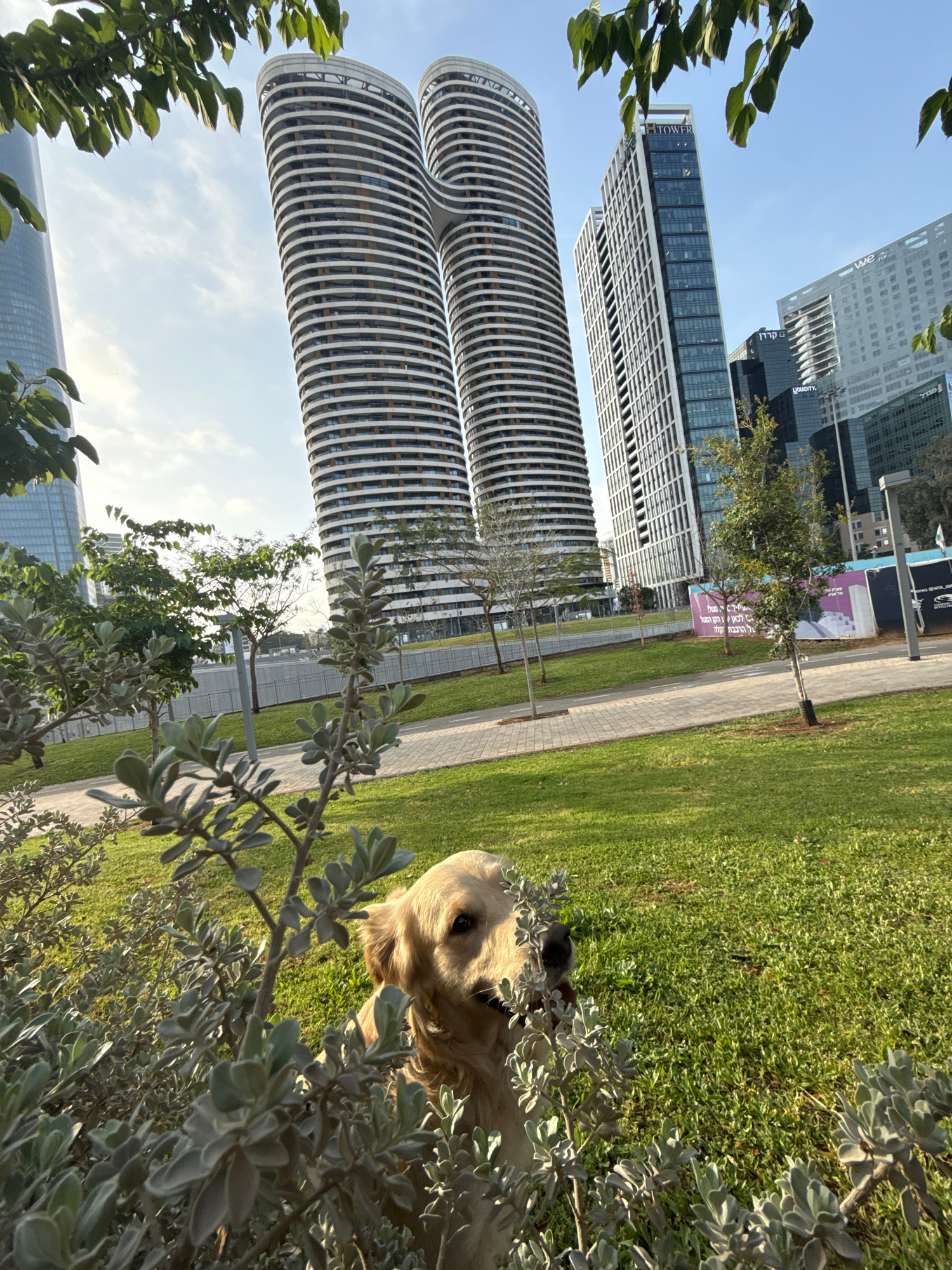 A medium shot shows a light-golden dog peeking out from behind a leafy bush. The scene is outdoors in a park setting, as evidenced by the green grass and manicured path. A modern cityscape in Tel-Aviv…read more