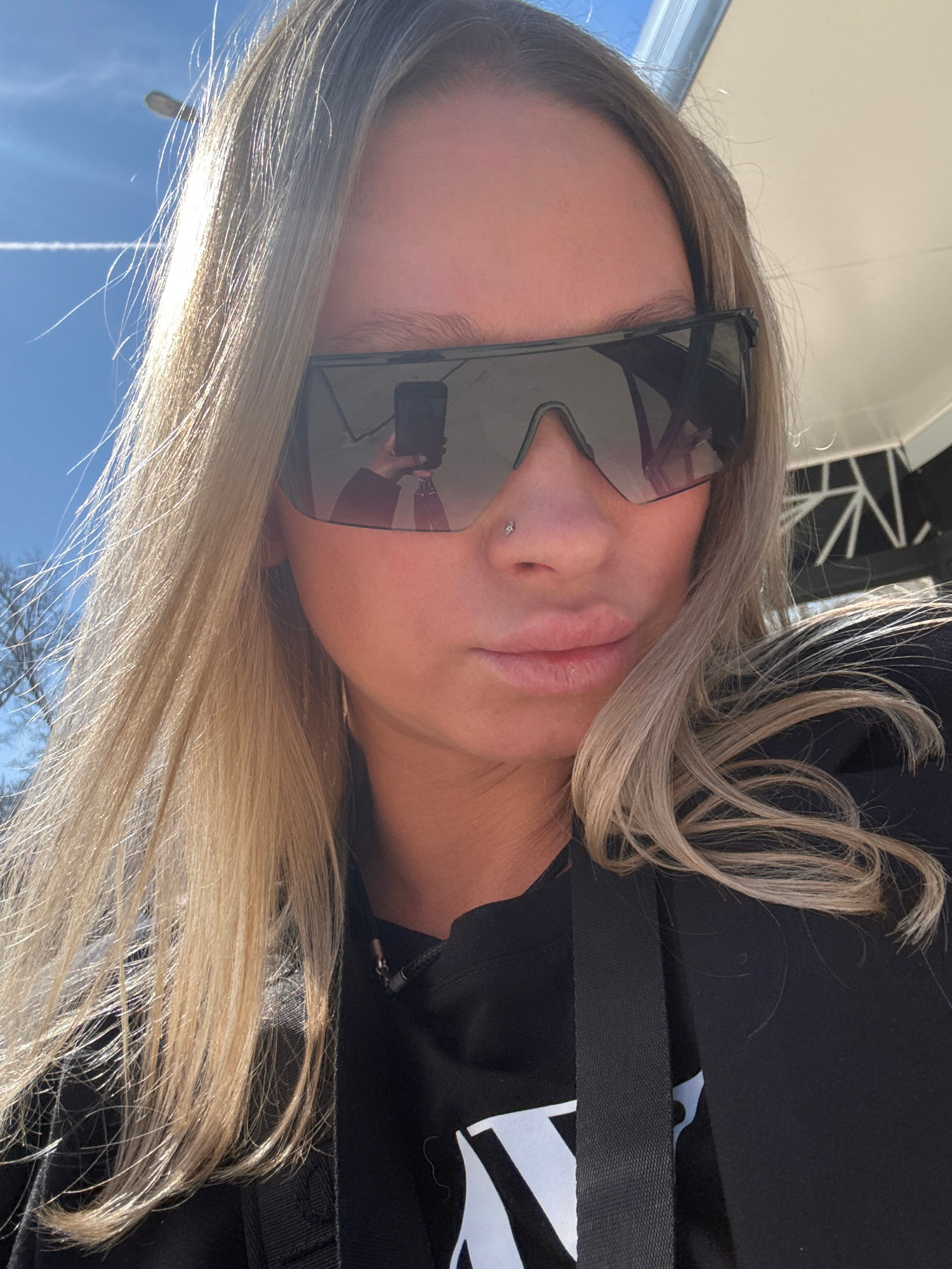 A close-up, canted, medium-shot depicts a blonde woman with a nose piercing wearing sunglasses and a black top with a white design. The reflection in the sunglasses shows someone holding a phone. The…read more