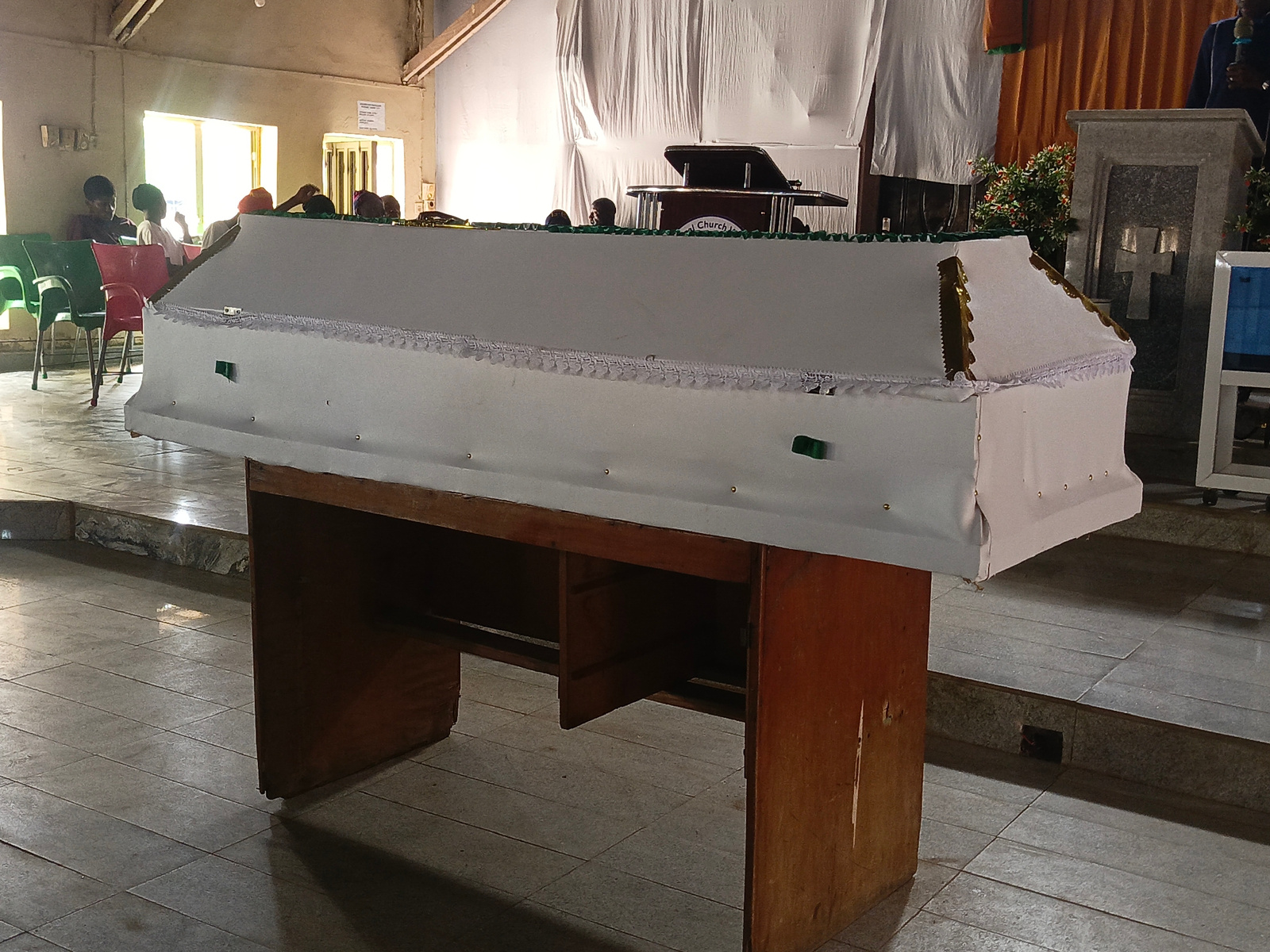 The image depicts an indoor scene, likely a funeral service or wake, set within a church or a large hall. In the foreground and central to the image is a white, fabric-draped coffin, resting on a simp…read more
