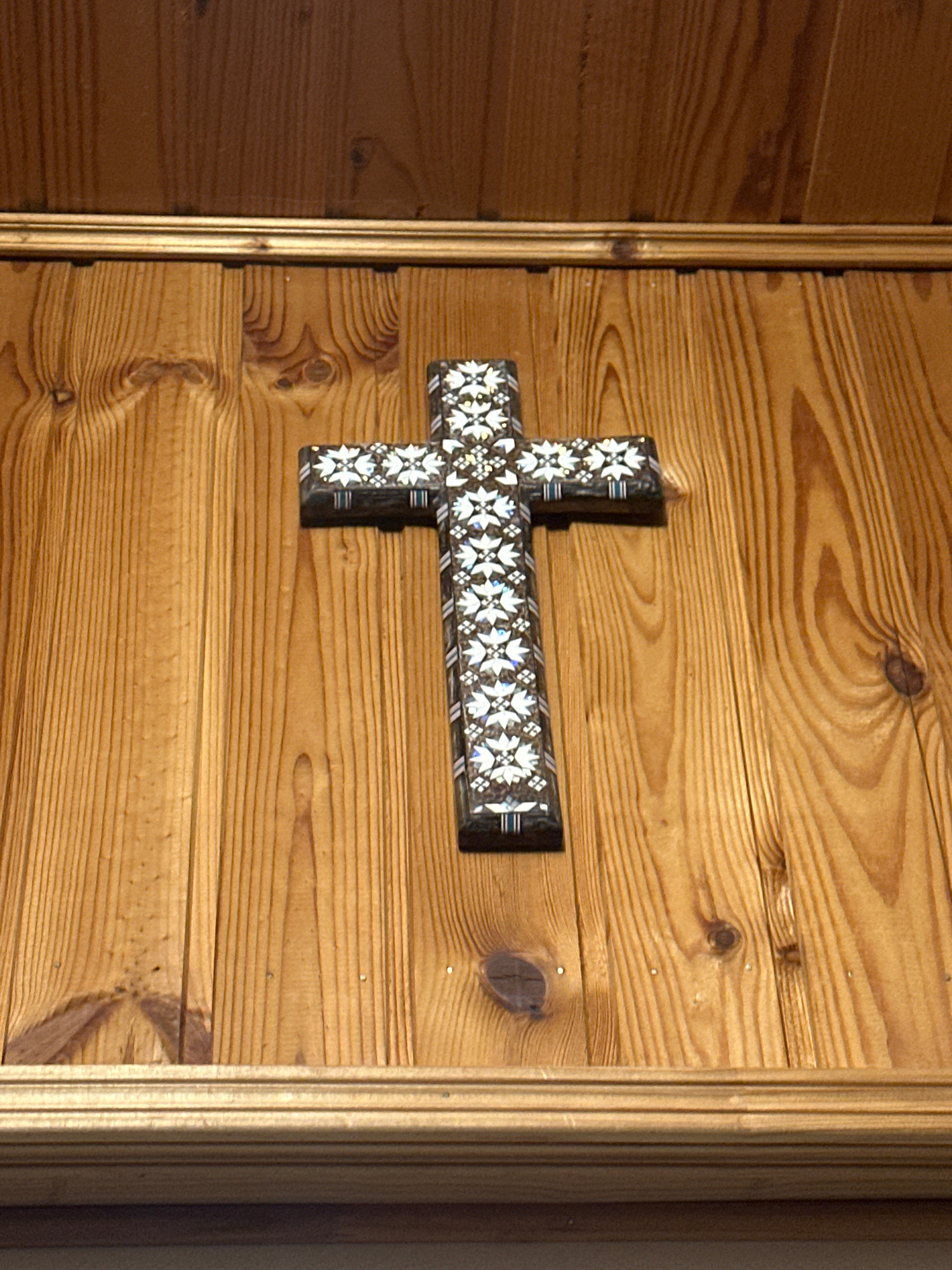 The image shows a wooden door with a decorative cross attached to it. The cross is dark in color and adorned with a pattern of white floral shapes. The door itself is made of light brown wood with a d…read more