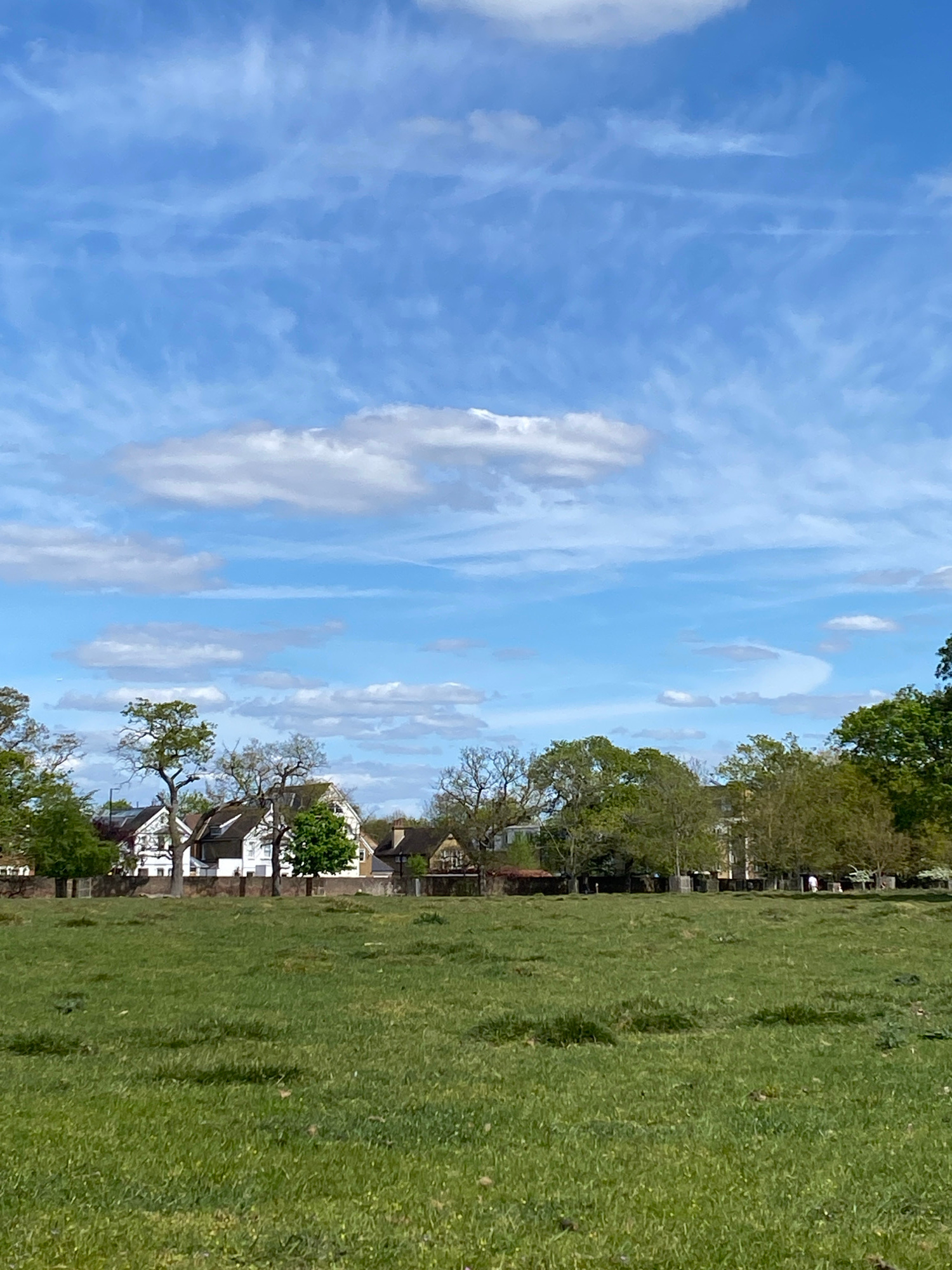The image shows a view of a green field in what appears to be a park. Along the horizon are trees and houses with pitched roofs. The sky is blue with scattered clouds. The orientation of the image is…read more