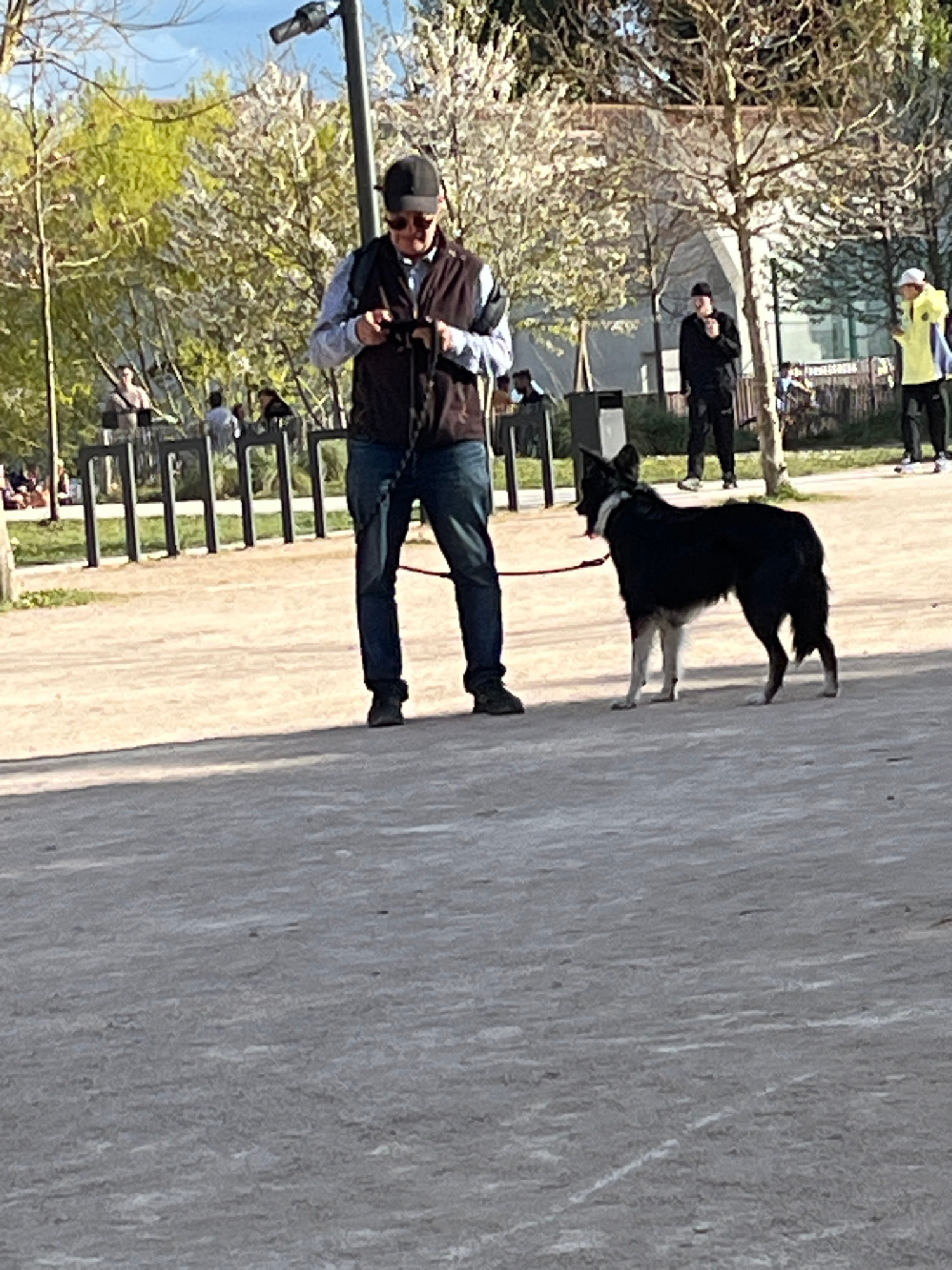 A person walks a black and white dog on a leash on a paved path in Saint-Just-Saint-Rambert, France. The person wears a black baseball cap, sunglasses, a light-colored button-up shirt, a dark vest, bl…read more