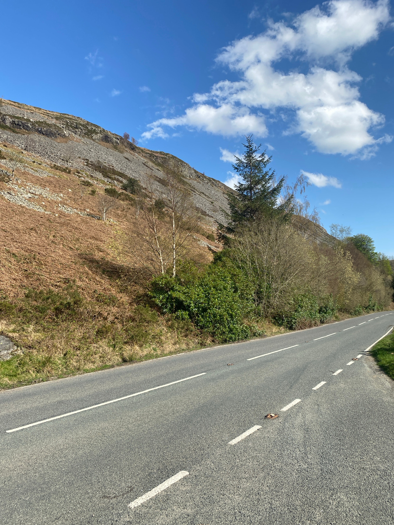 The image depicts a road running alongside a steep, rocky hillside in Llangynog, United Kingdom. The road is paved with gray asphalt and has white dashed lane markings and cat's eye reflectors. The hi…read more