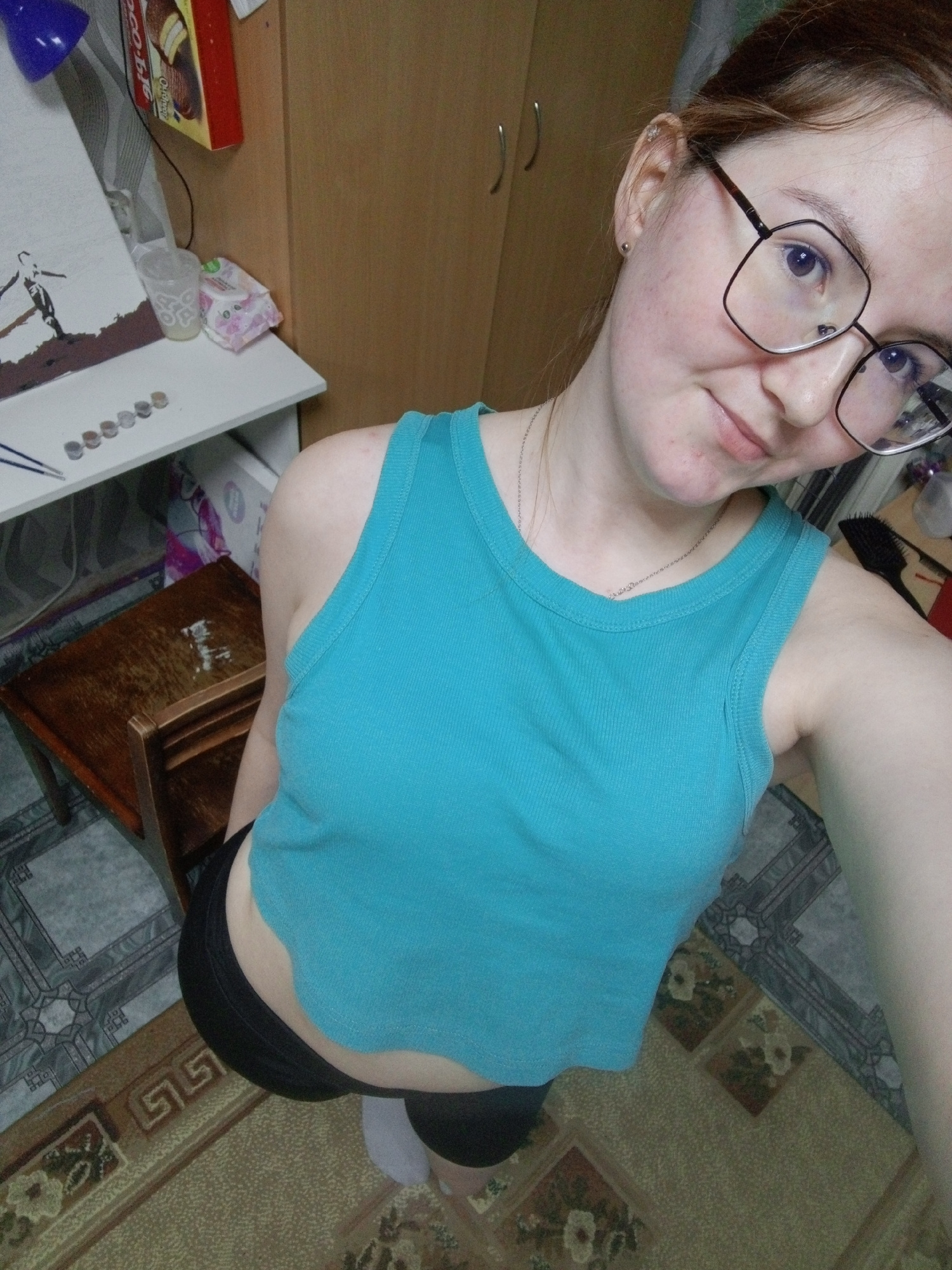 A woman with fair skin and reddish-brown hair pulled back is depicted in a close-up, high-angle shot. She is wearing black square-framed glasses and a teal cropped tank top, as well as black shorts. A…read more