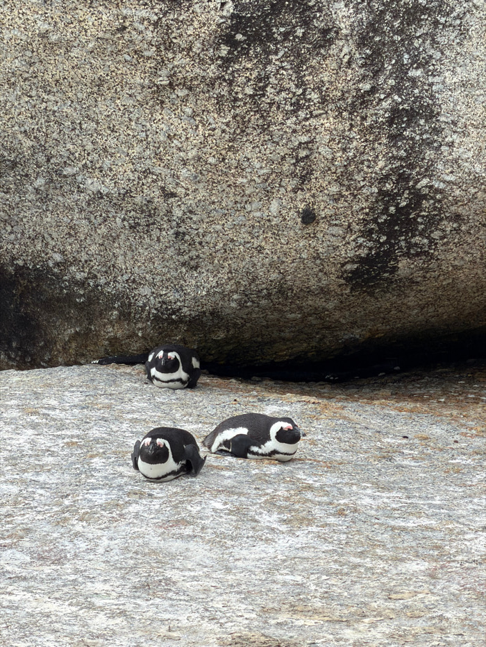 The image depicts three African penguins (Spheniscus demersus) resting on the granite boulders of Boulders Beach, a protected colony located in Simon's Town, South Africa. The foreground shows a light…read more