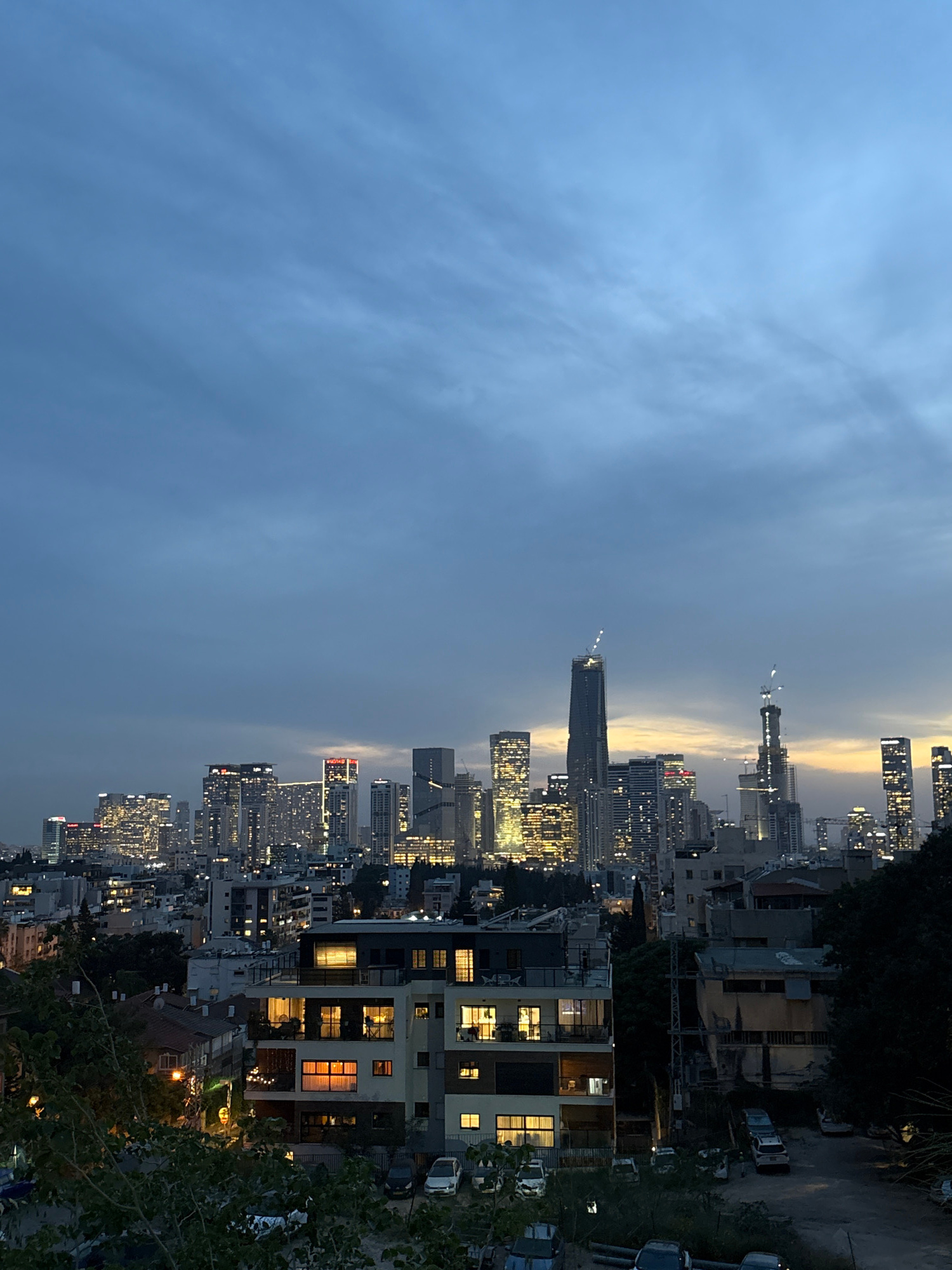 The image depicts a nighttime cityscape, likely Givatayim, Israel, viewed from an elevated position. In the foreground, there are residential buildings with lit windows and parked cars lining the stre…read more