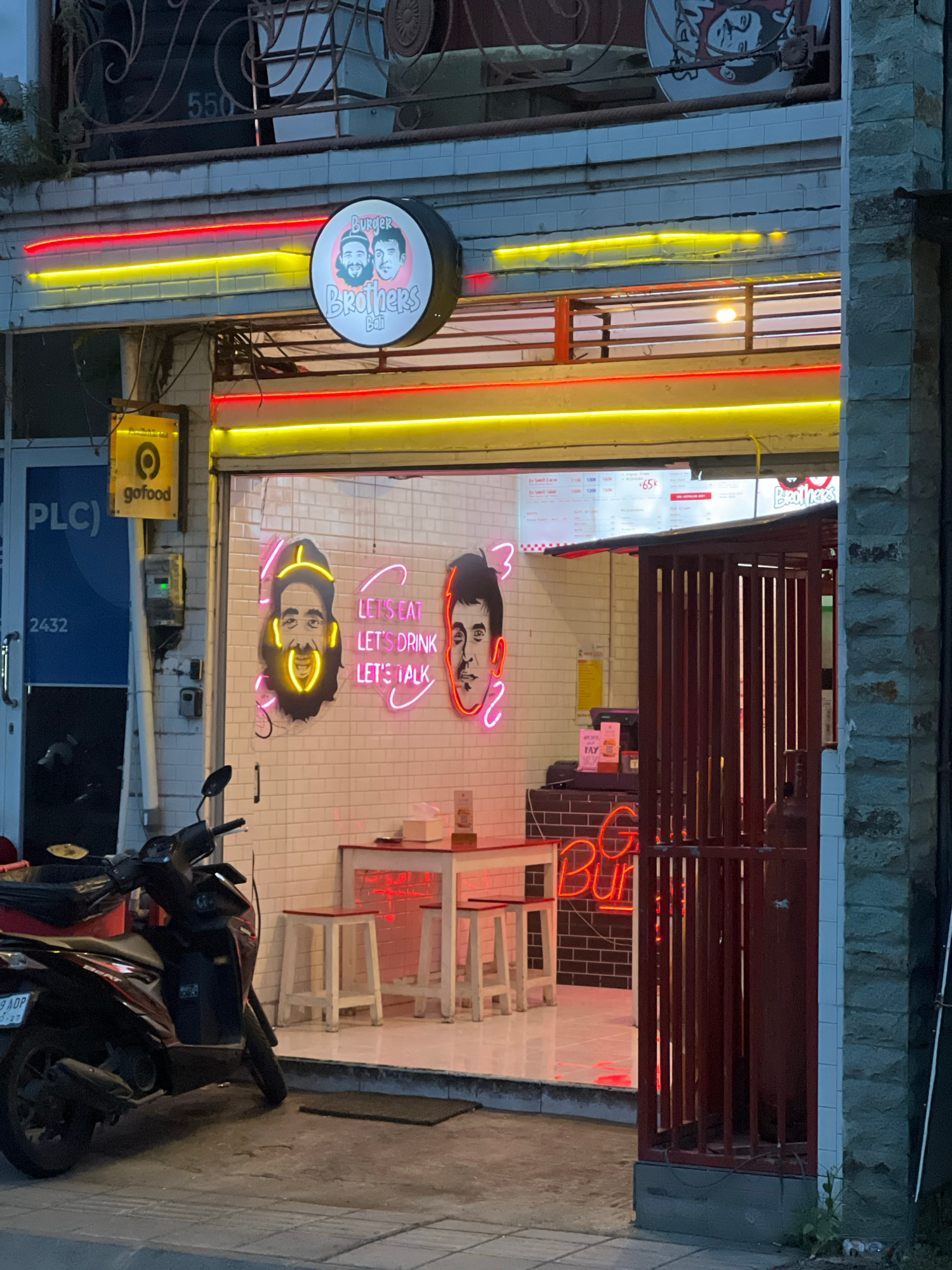 The image depicts the exterior of "Burger Brothers Bali," a restaurant located in Tibubeneng, Indonesia. The restaurant features neon signs of two men's faces and the text "LET'S EAT, LET'S DRINK, LET…read more