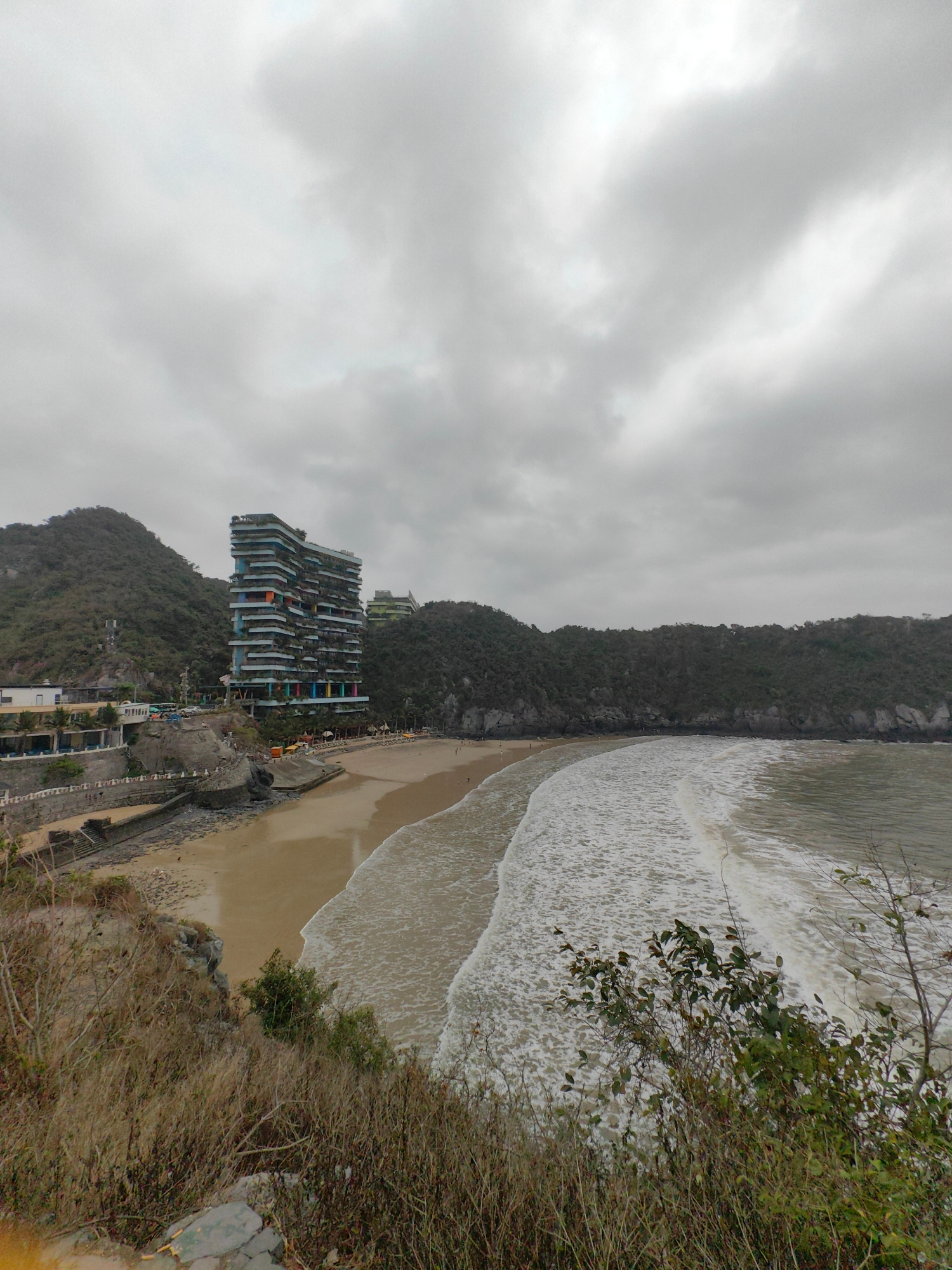Captured from an elevated viewpoint, the image presents a coastal scene in Hải Phòng, Vietnam under an overcast sky. Dominating the view is a sandy beach curving along the bay, with waves breaking ont…read more