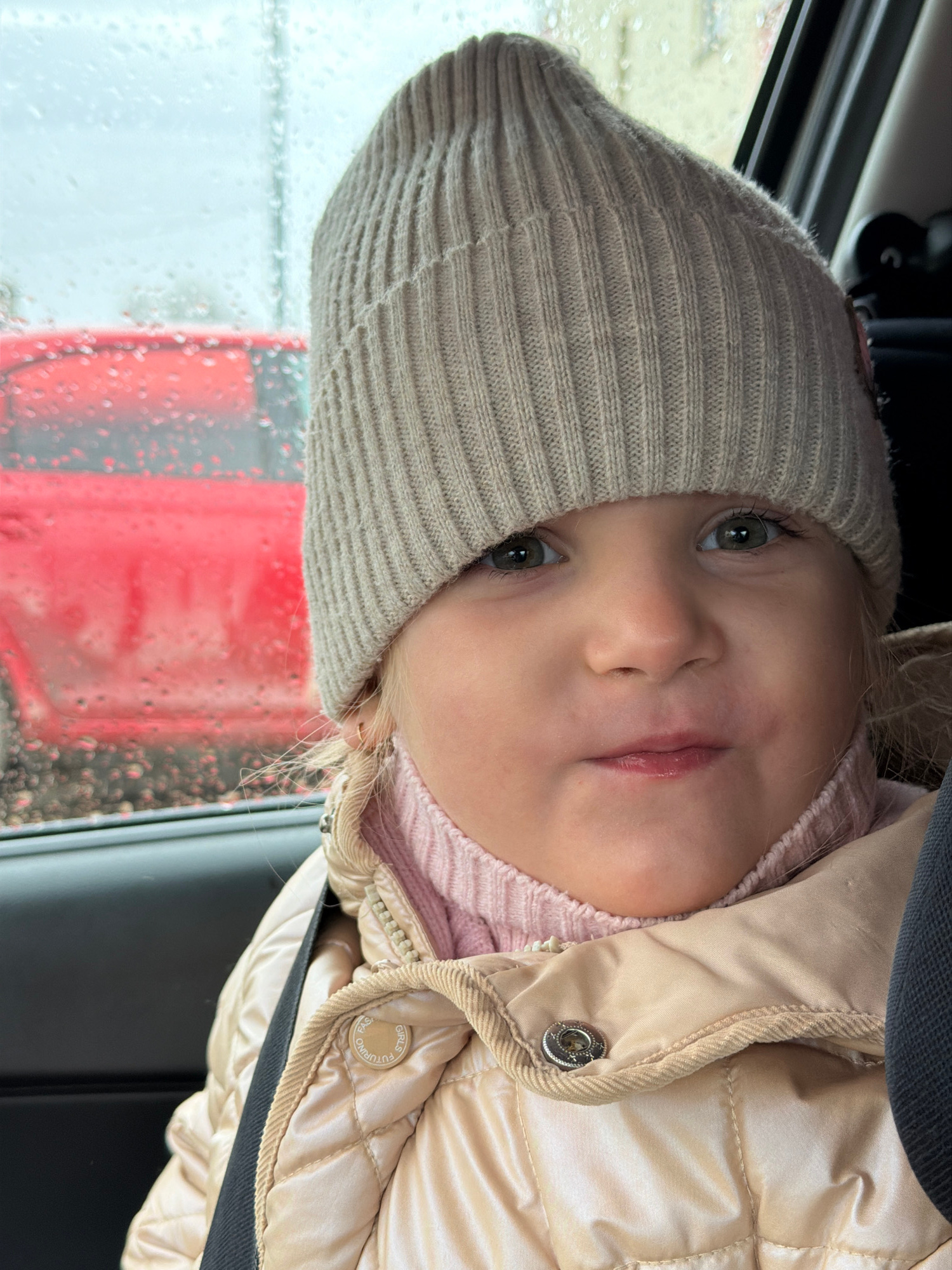 A young child wearing a beige knit hat and a tan puffer jacket is looking at the camera. The child is in what appears to be a vehicle, with a rain-streaked window behind them. The reflection of a red…read more