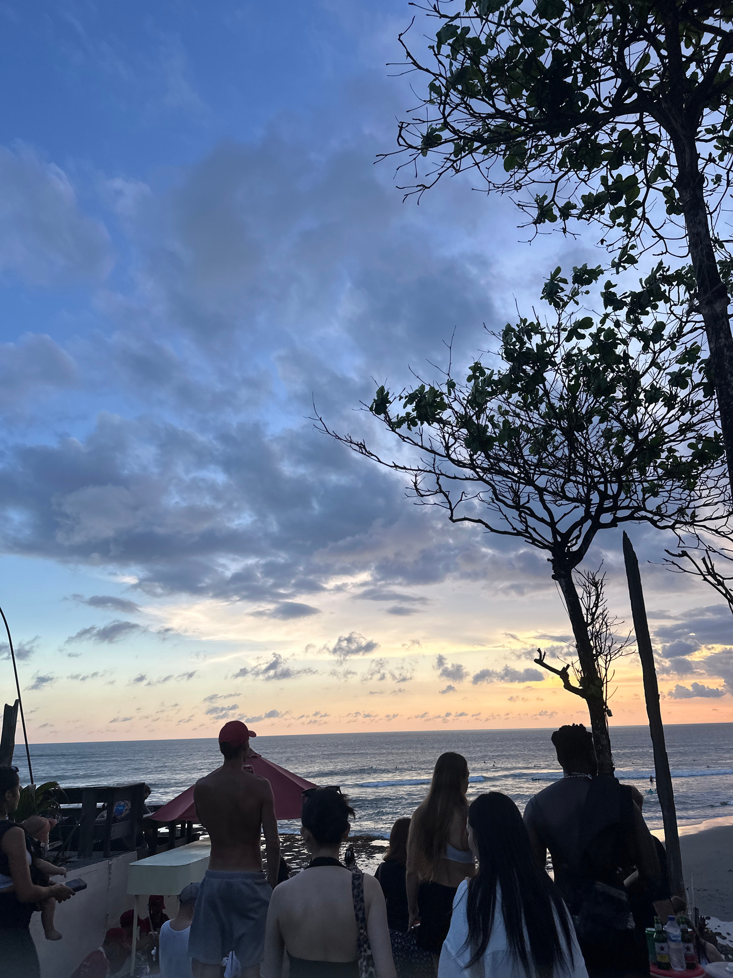 The image captures a sunset scene on a beach, likely in Canggu, Indonesia, given the coastal environment and typical setting. In the foreground, a group of people are standing and interacting, partial…read more