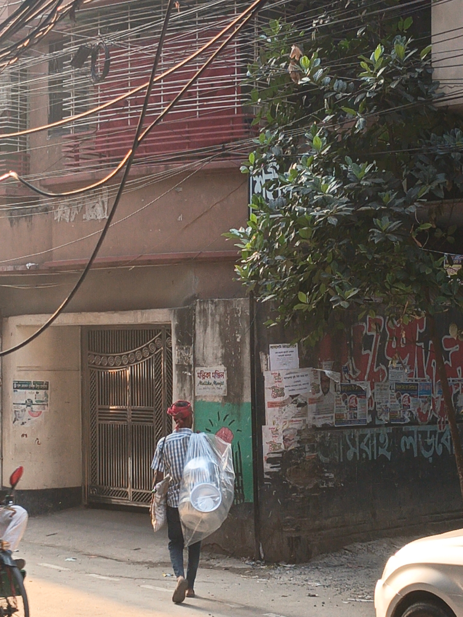 A man with a red head covering walks away from a building in Dhaka, Bangladesh. He carries a large, clear plastic bag filled with white objects, possibly dishes, over his right shoulder. He wears a chβ¦read more