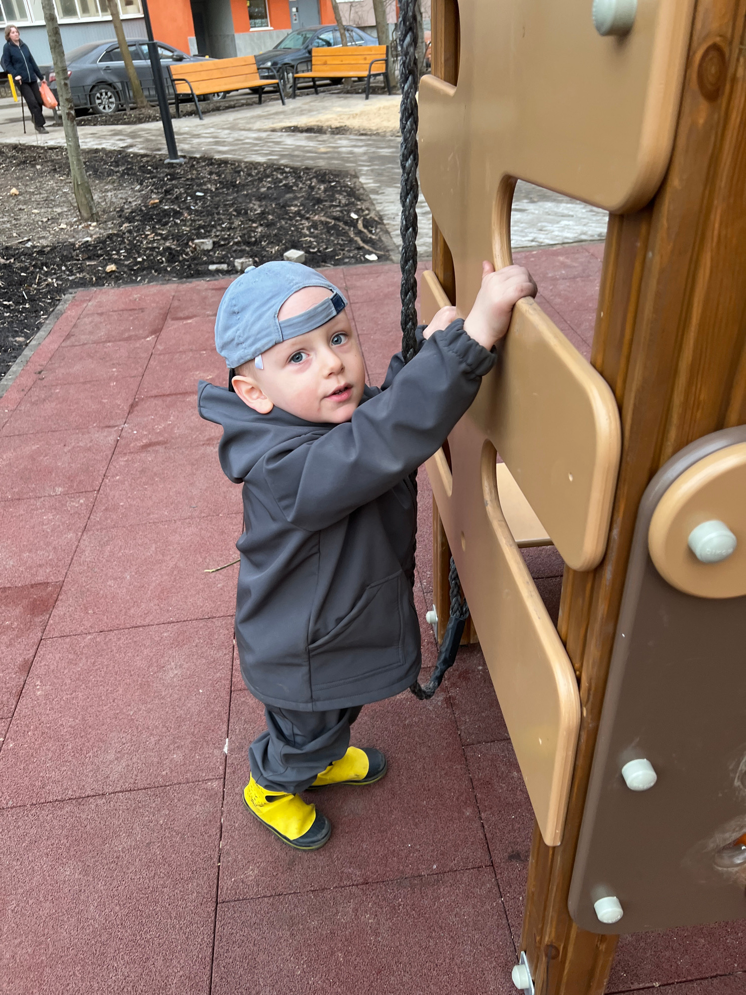 A young child in a grey hooded jacket, grey hat, and yellow boots is hanging upside down from a wooden playground structure in Mytishchi, Russia. The structure has brown wooden rungs. The ground is co…read more