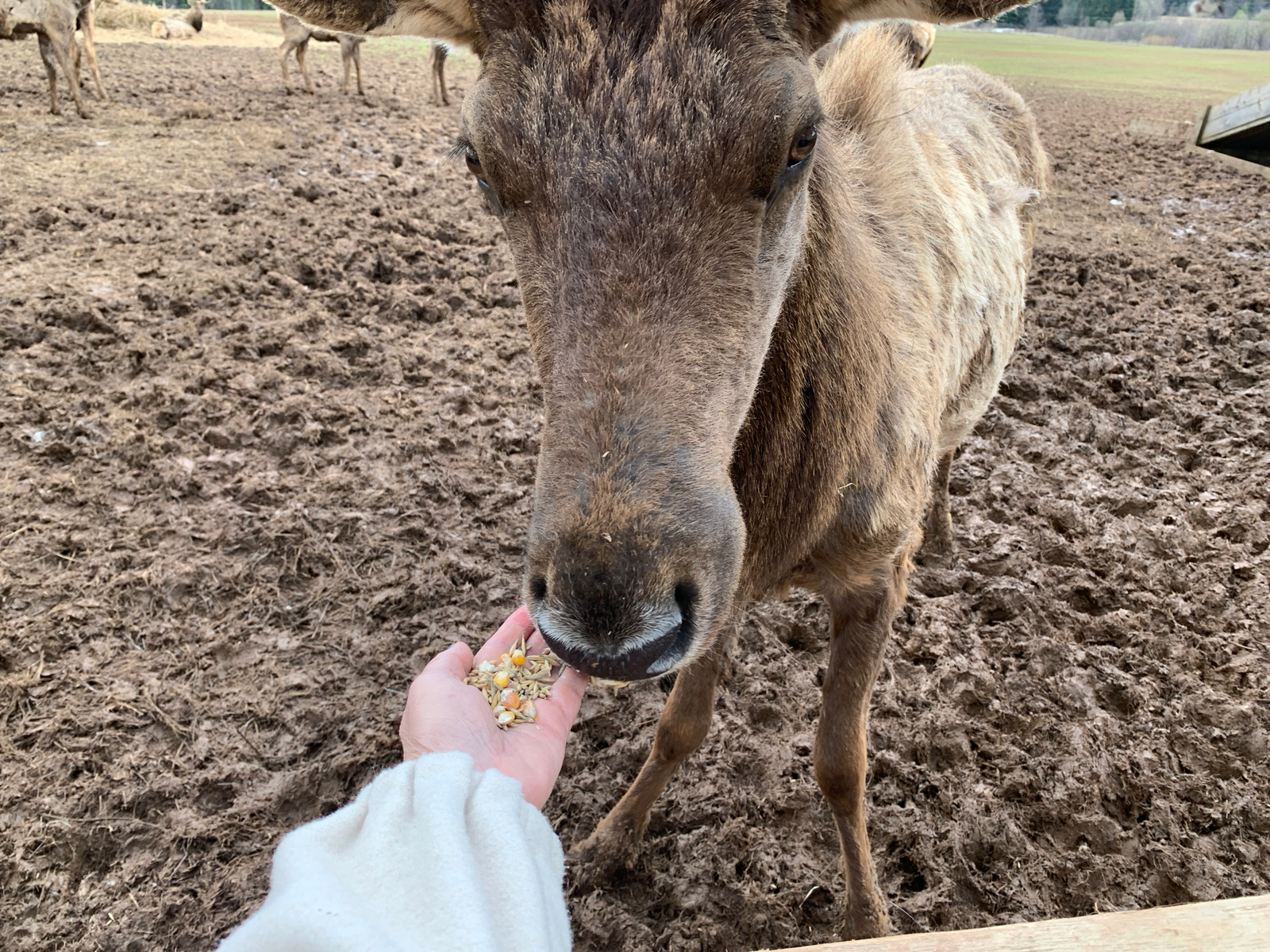 In a muddy field in Malaya Ven'ya, Russia, a light-brown deer is eating corn and wheat from a person's outstretched hand. The person is wearing a white fleece sweater. Other deer are visible in the ba…read more